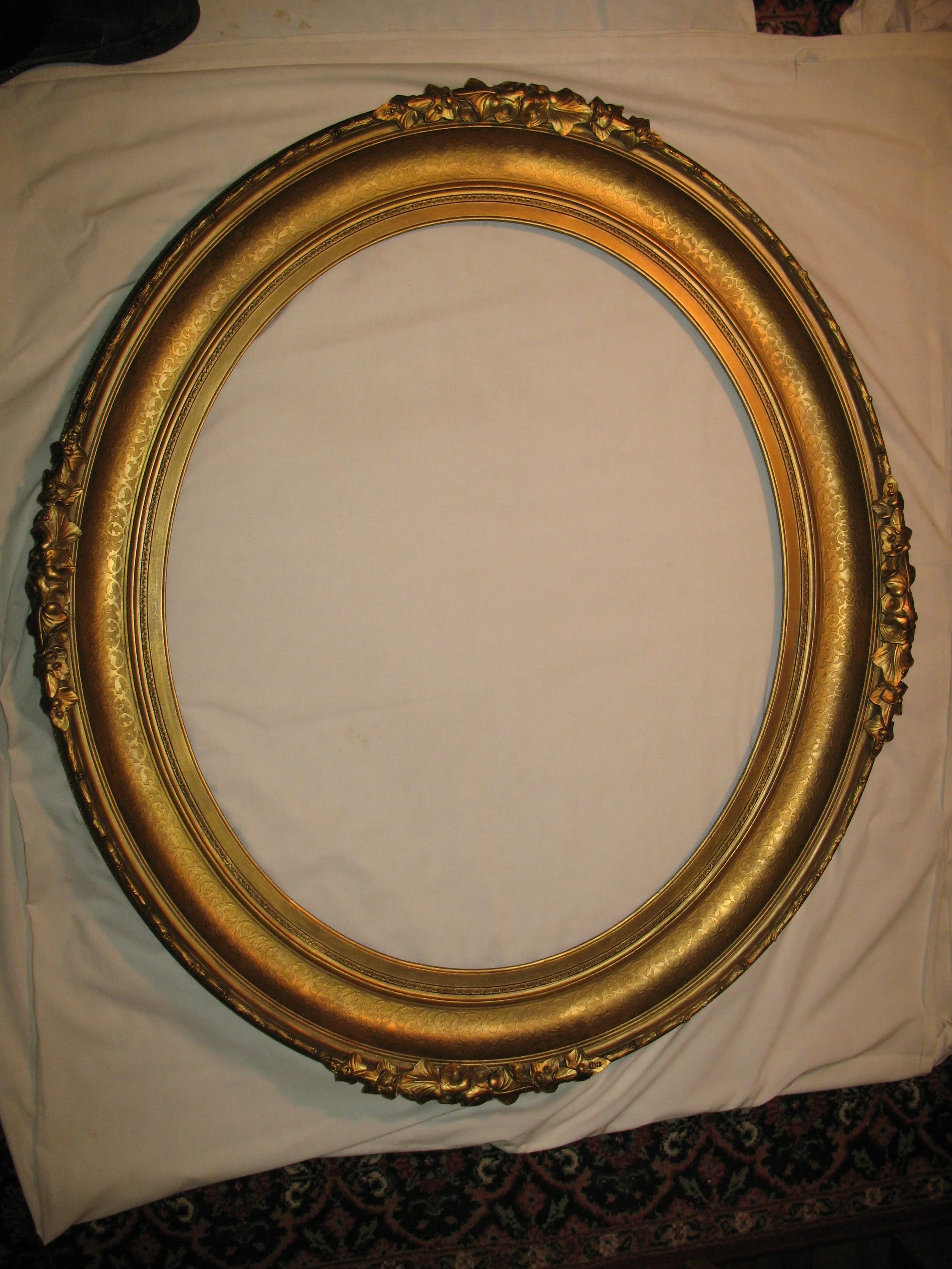 An ornate, oval gold picture frame placed upside down on a white cloth. View fullsize