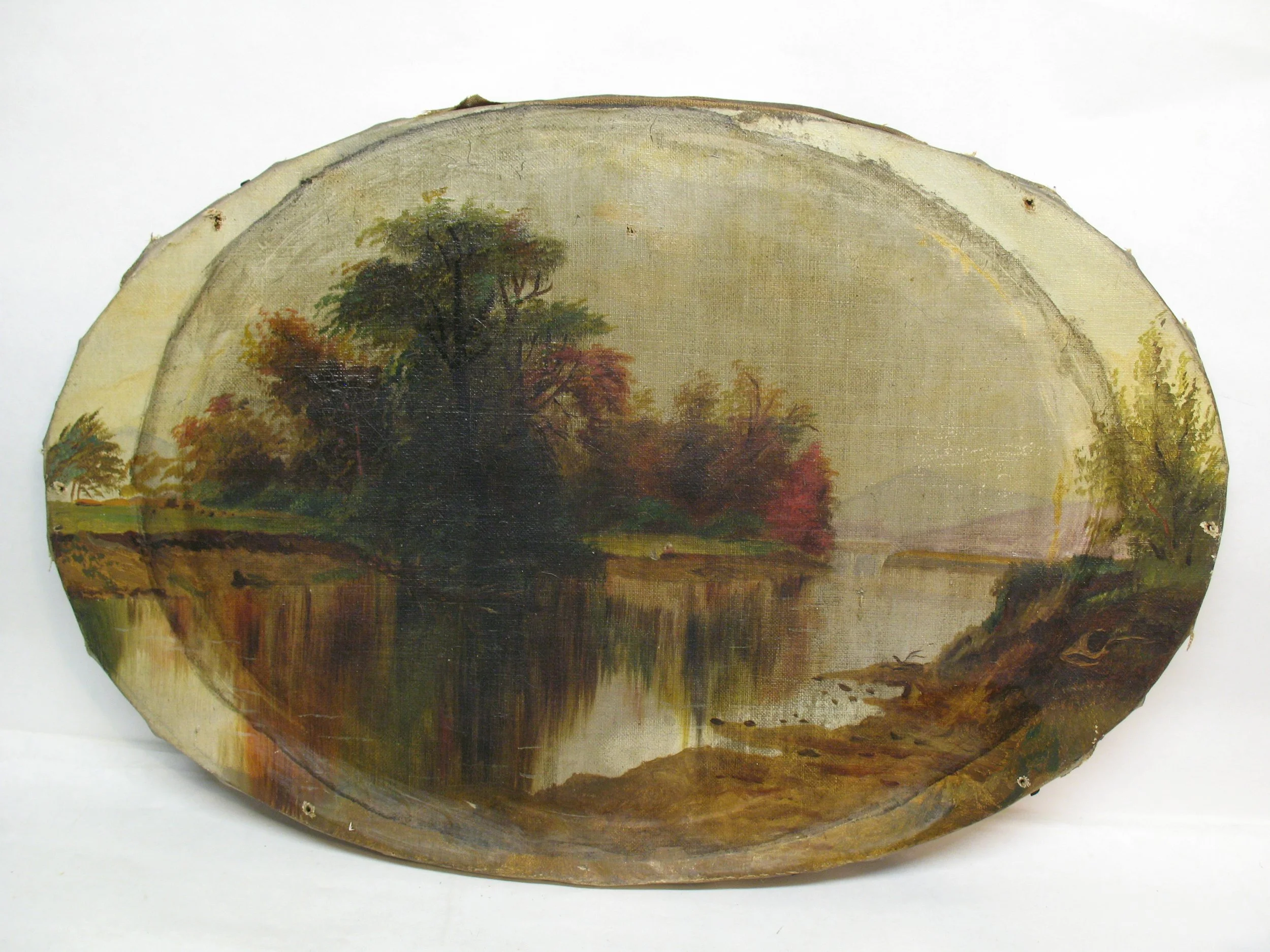 Landscape painting of trees and river on an oval-shaped wooden panel