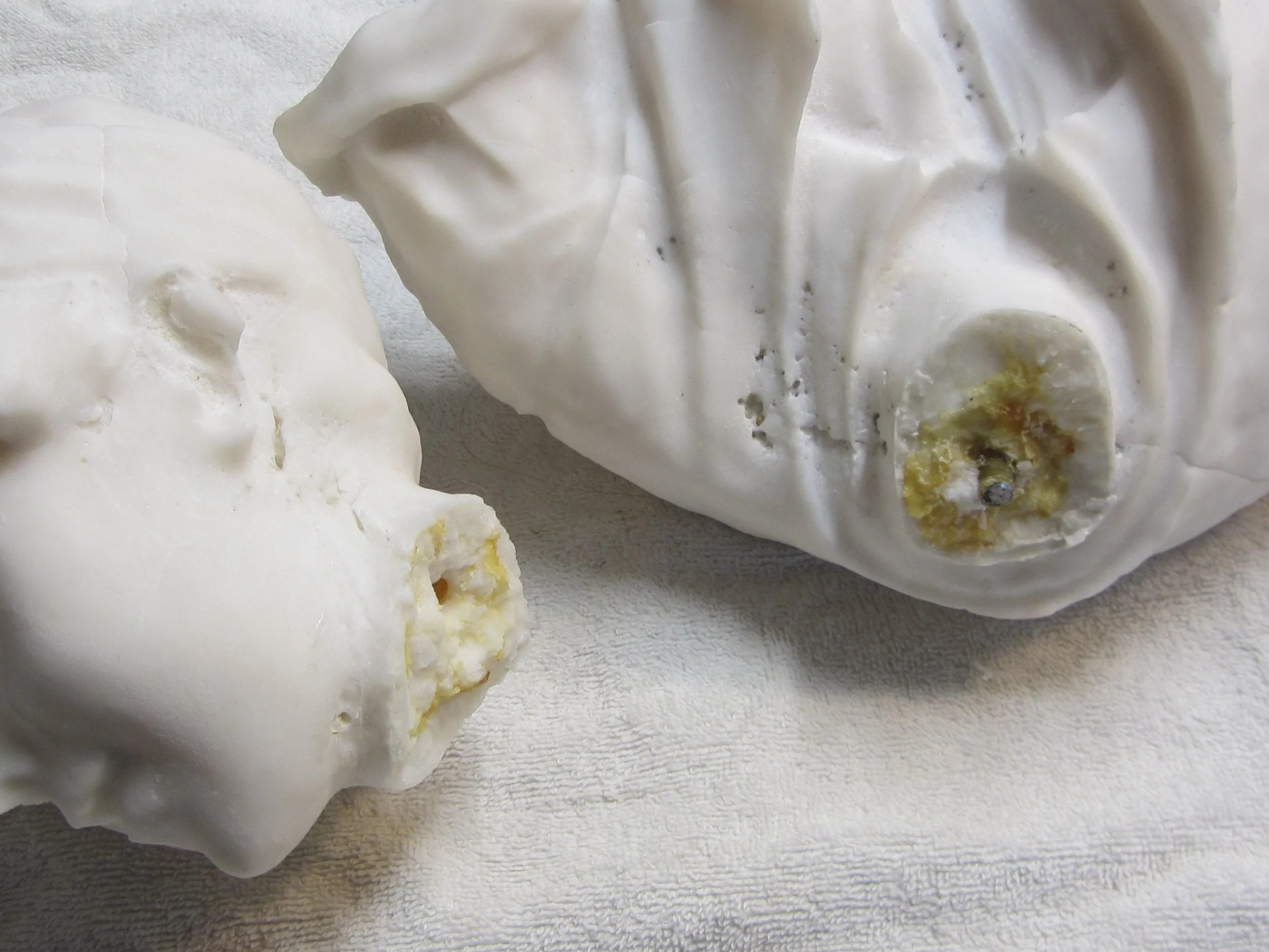Two broken white plaster casts of feet on a white towel. View fullsize
