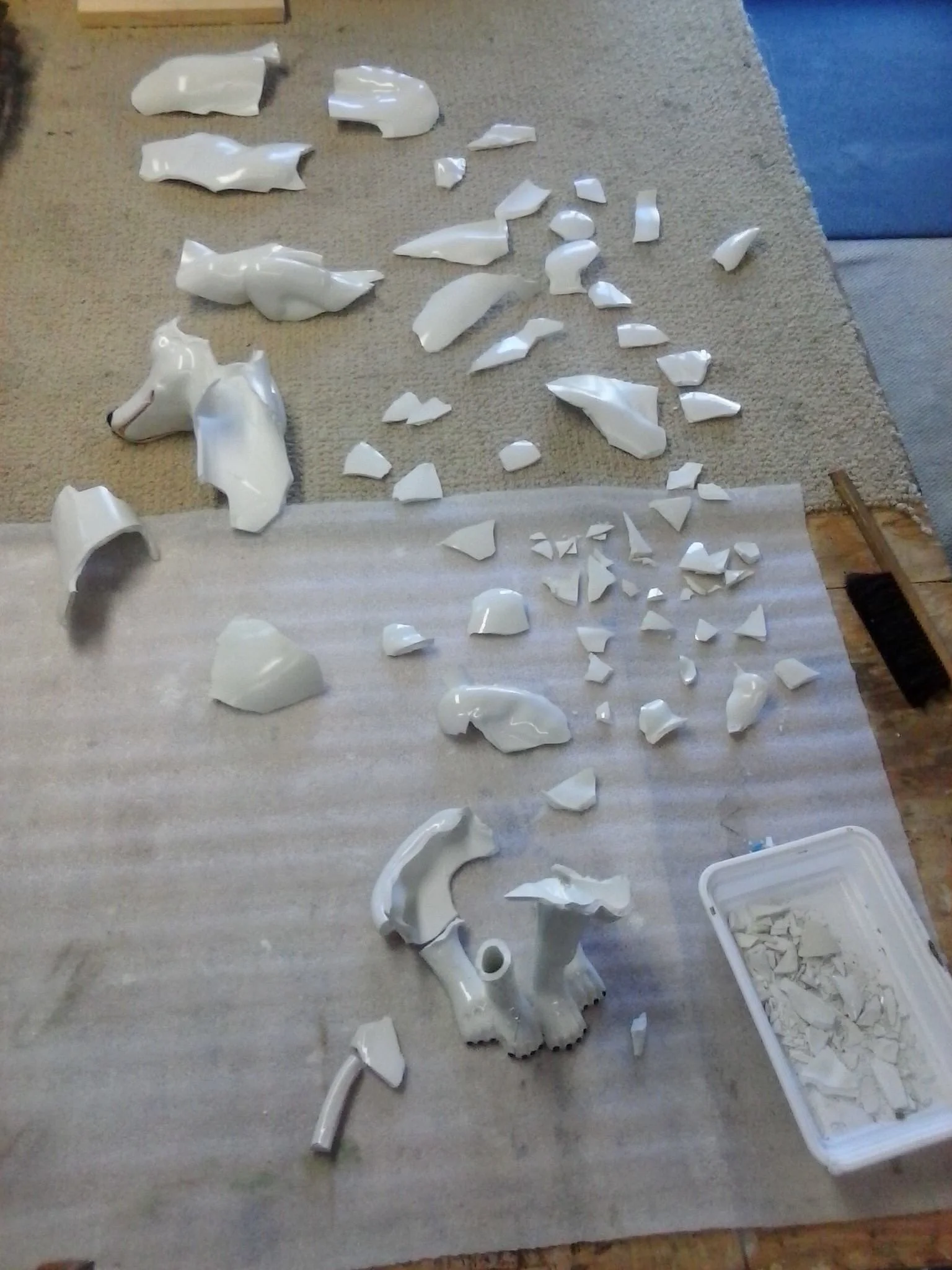 Broken ceramic figurine pieces that make up a ceramic whippet dog figurine. View fullsize