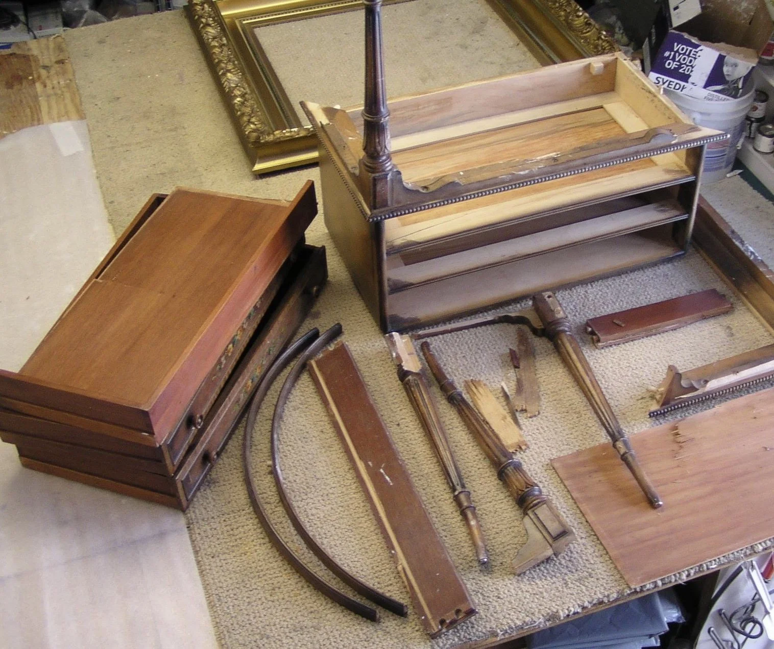 Disassembled wooden furniture parts on a worktable, including shelves, legs, and decorative trim, with a gold picture frame and various tools. View fullsize