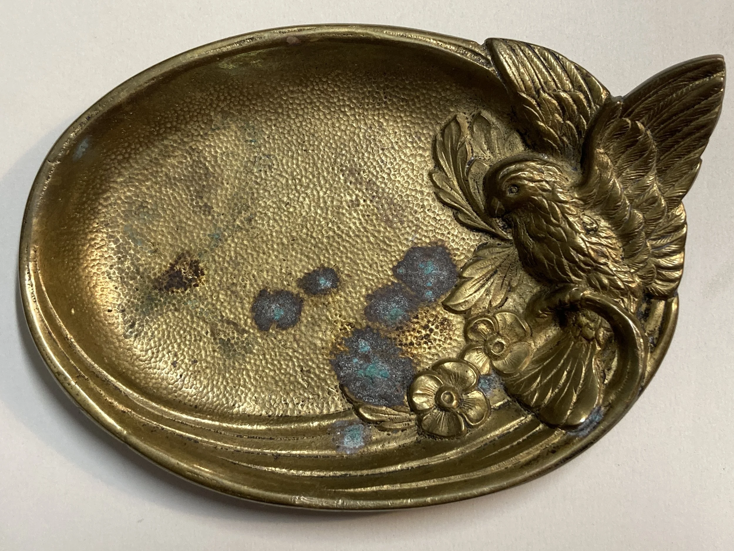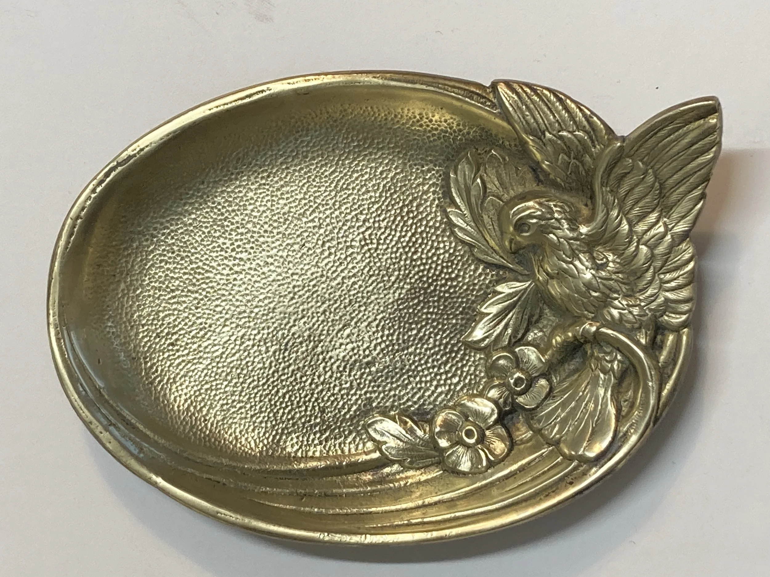 A vintage gold-toned oval decorative tray with a raised bird and floral design on one side, showing some tarnish and wear.