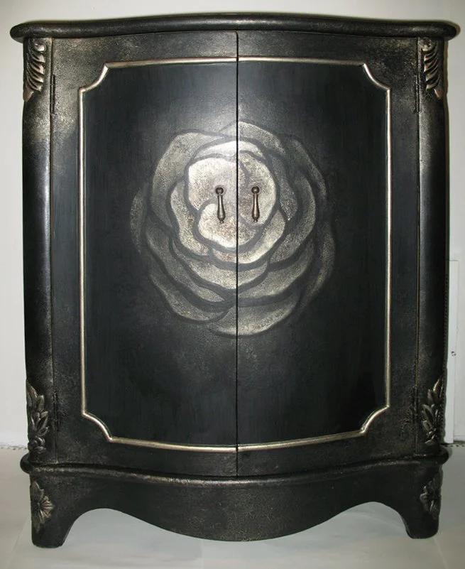An antique black wooden cabinet with ornate carvings and a floral design on the doors, featuring a white flower painted on the front. View fullsize