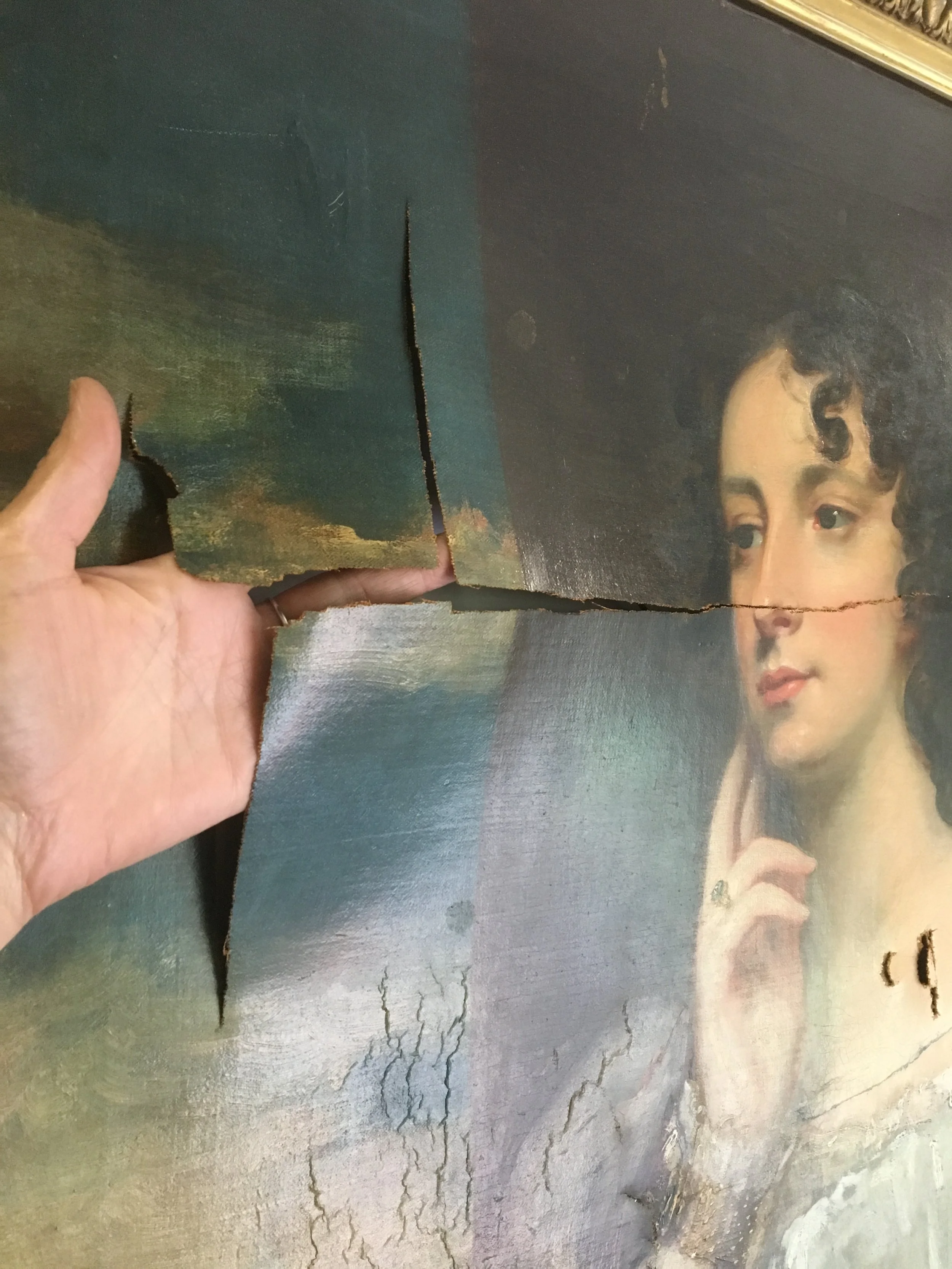 The damaged painting before repair, a close-up of a hand lifting a torn section of an old oil painting, revealing a portrait of a woman with curly dark hair, wearing a ring and resting her chin on her hand. View fullsize