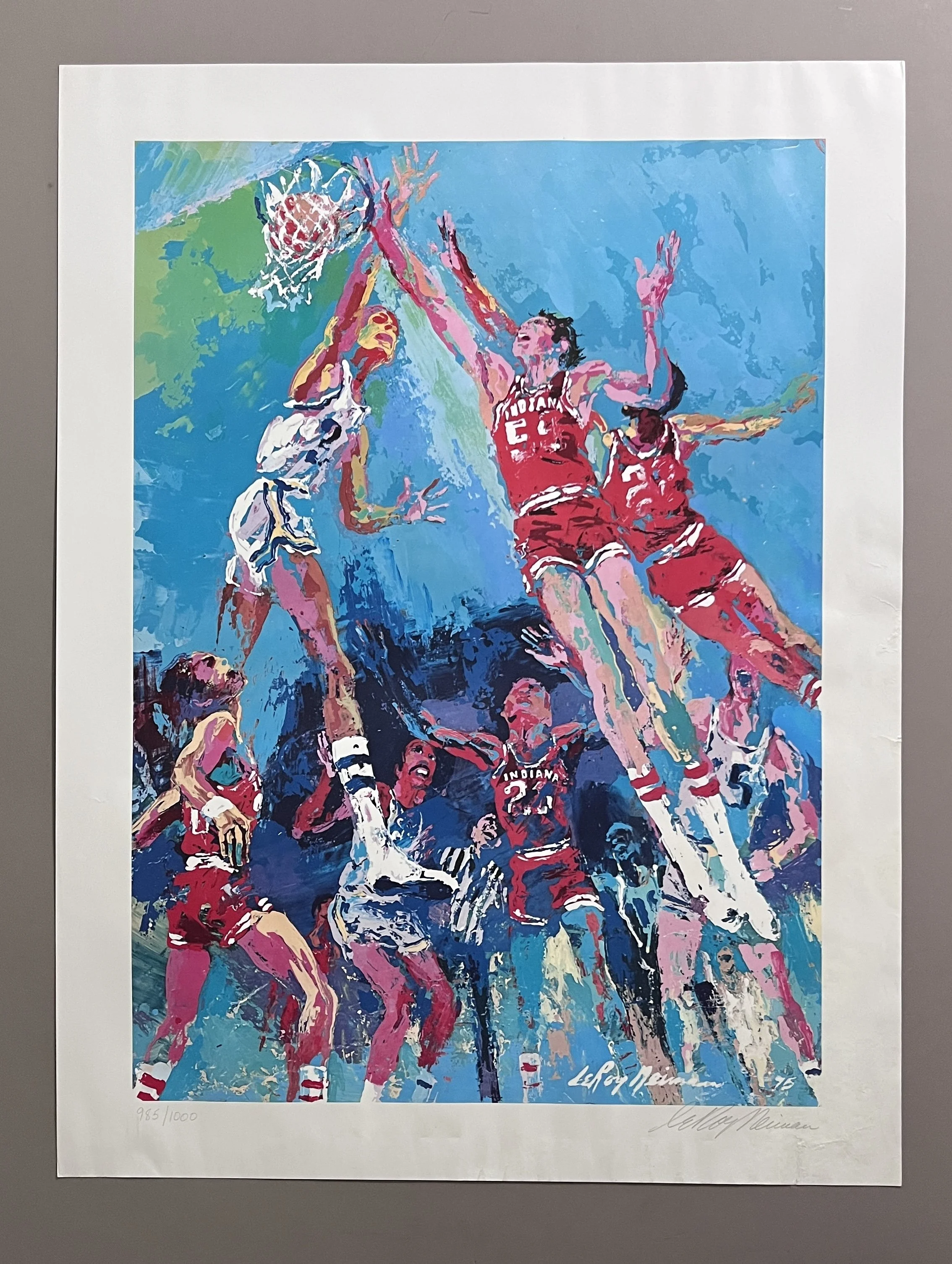 Painted artwork of a basketball game featuring Indiana players, with two players jumping to attempt a shot or block, surrounded by fans and other players.
