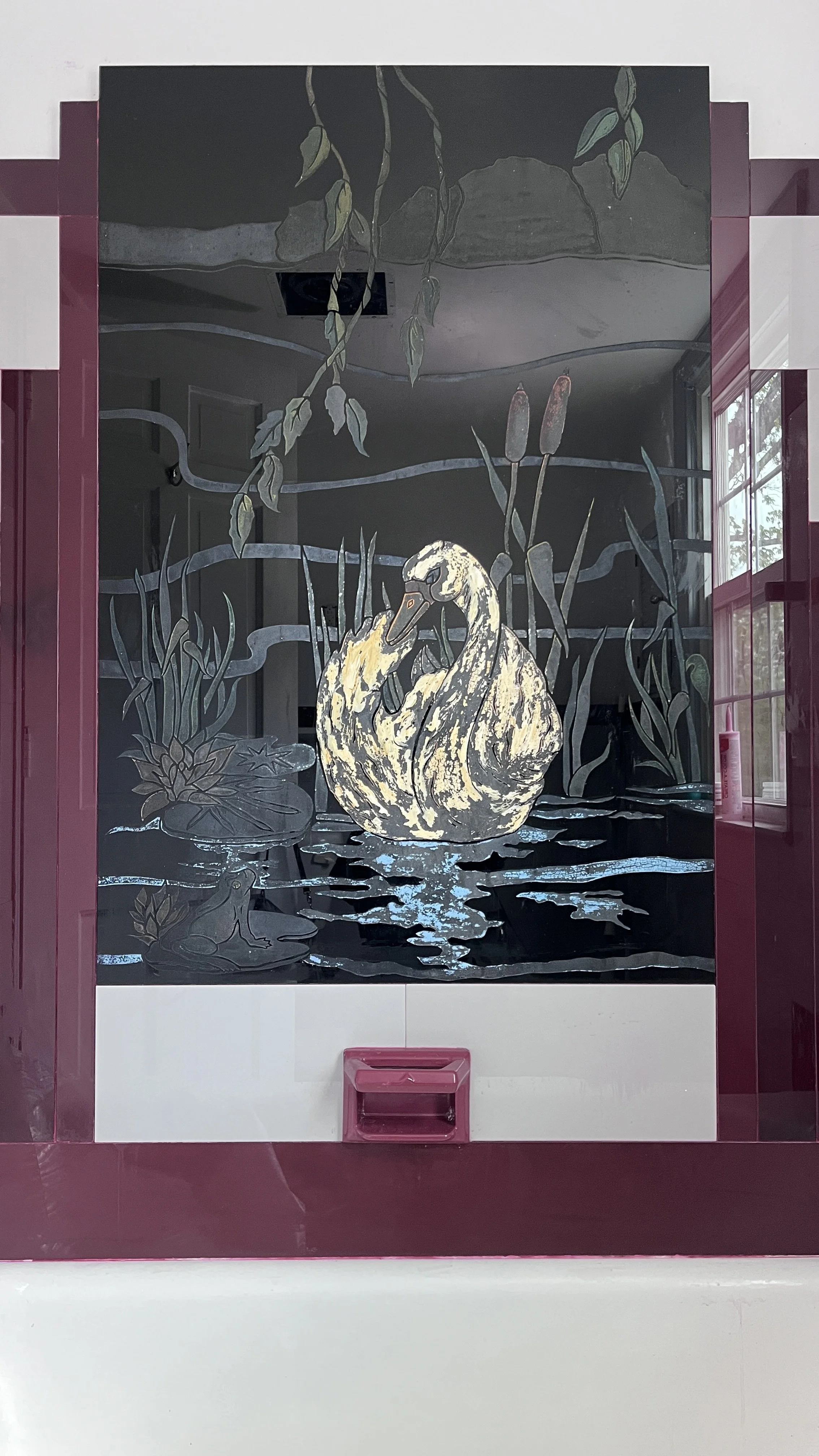 Decorative glass artwork depicting swans in a pond with lily pads and tall reeds.