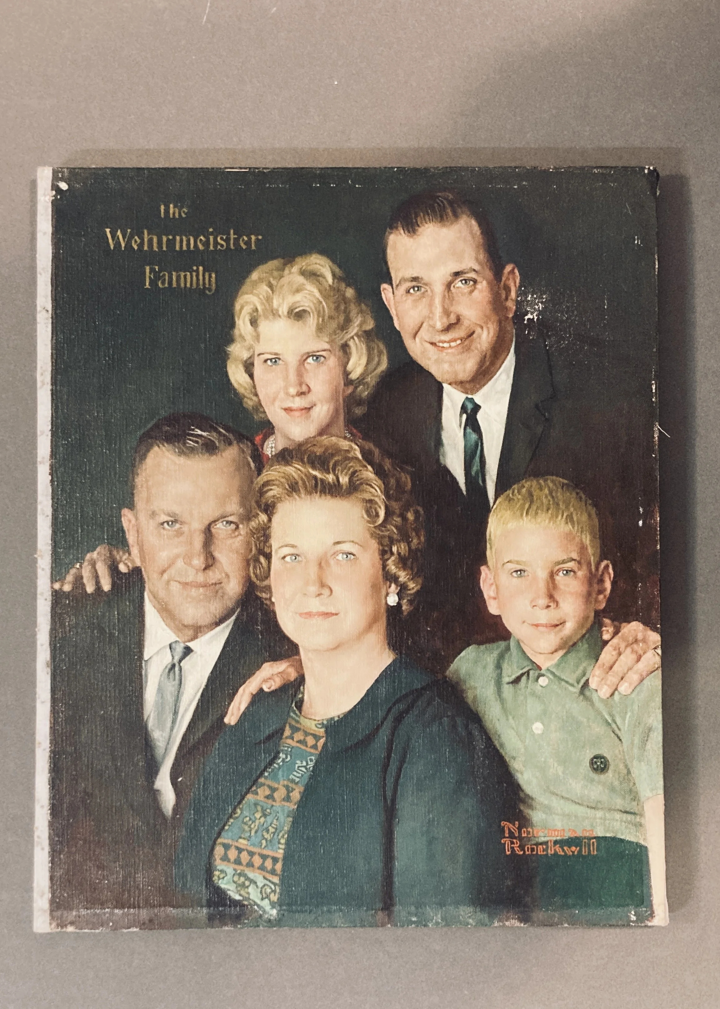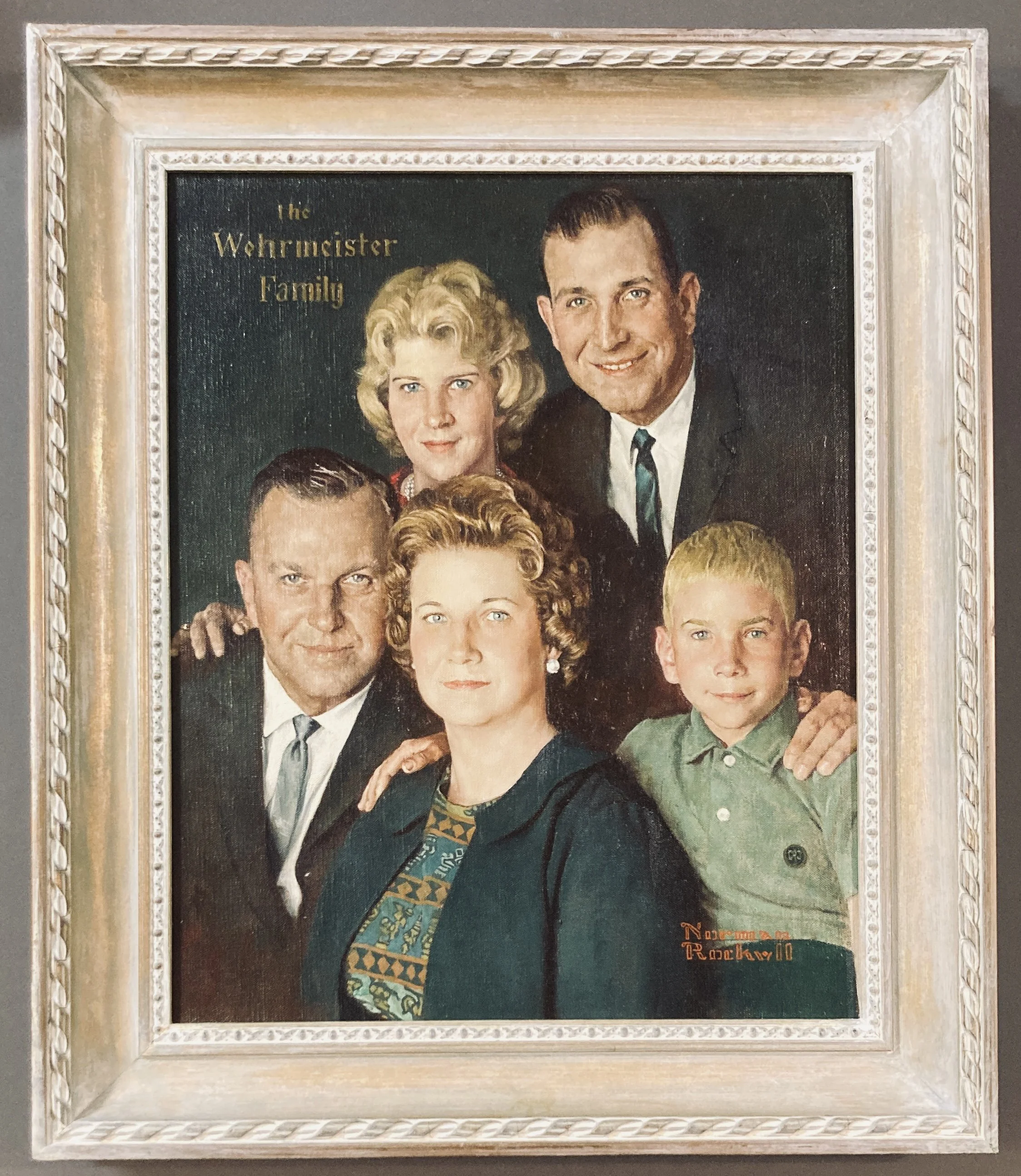 A framed portrait of the Wehrister family, including five members: two men, two women, and a young boy, dressed in formal attire, with the family name written in the top left corner of the portrait.