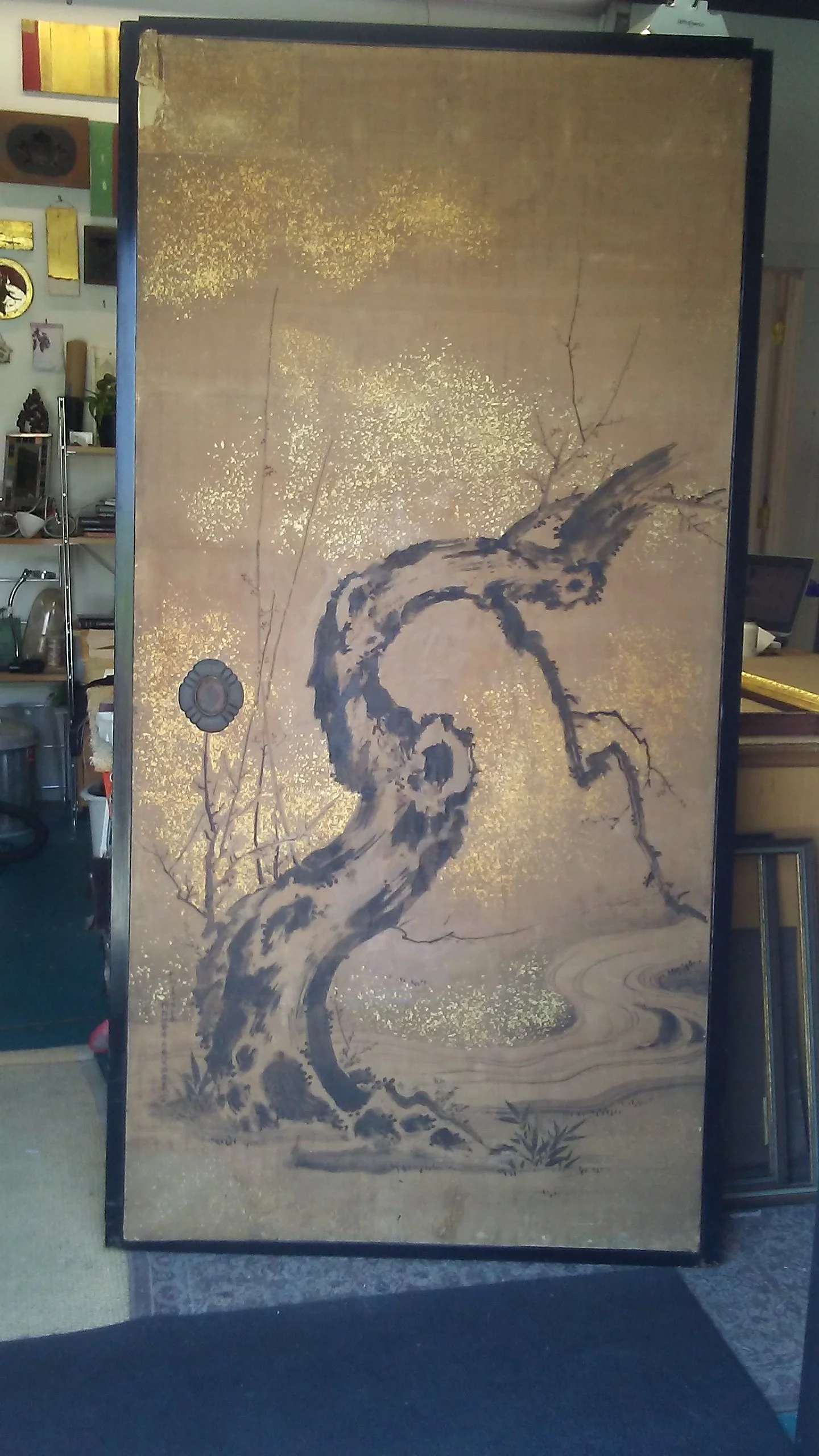 The Chinese folding fan after it's been repaired. The painted scene of two men riding oxen, one holding a birdcage, and a large tree on the left side now more clear. View fullsize