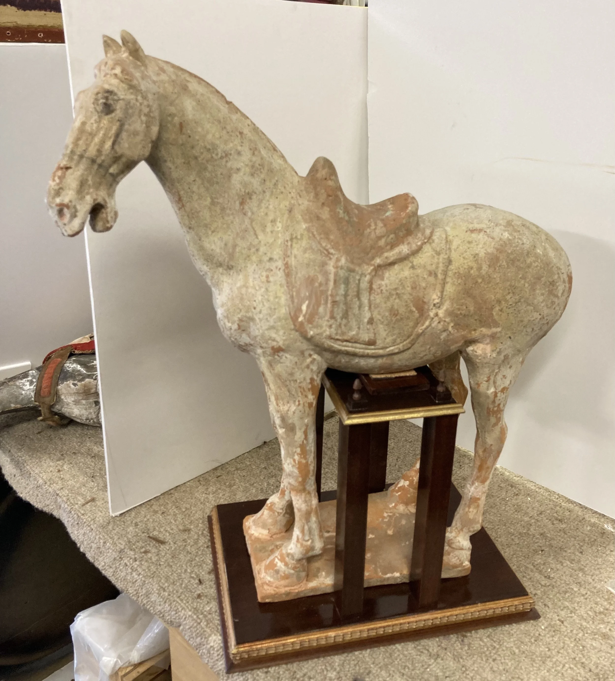 A vintage, weathered ceramic or plaster horse sculpture with a saddle, mounted on a wooden stand. View fullsize