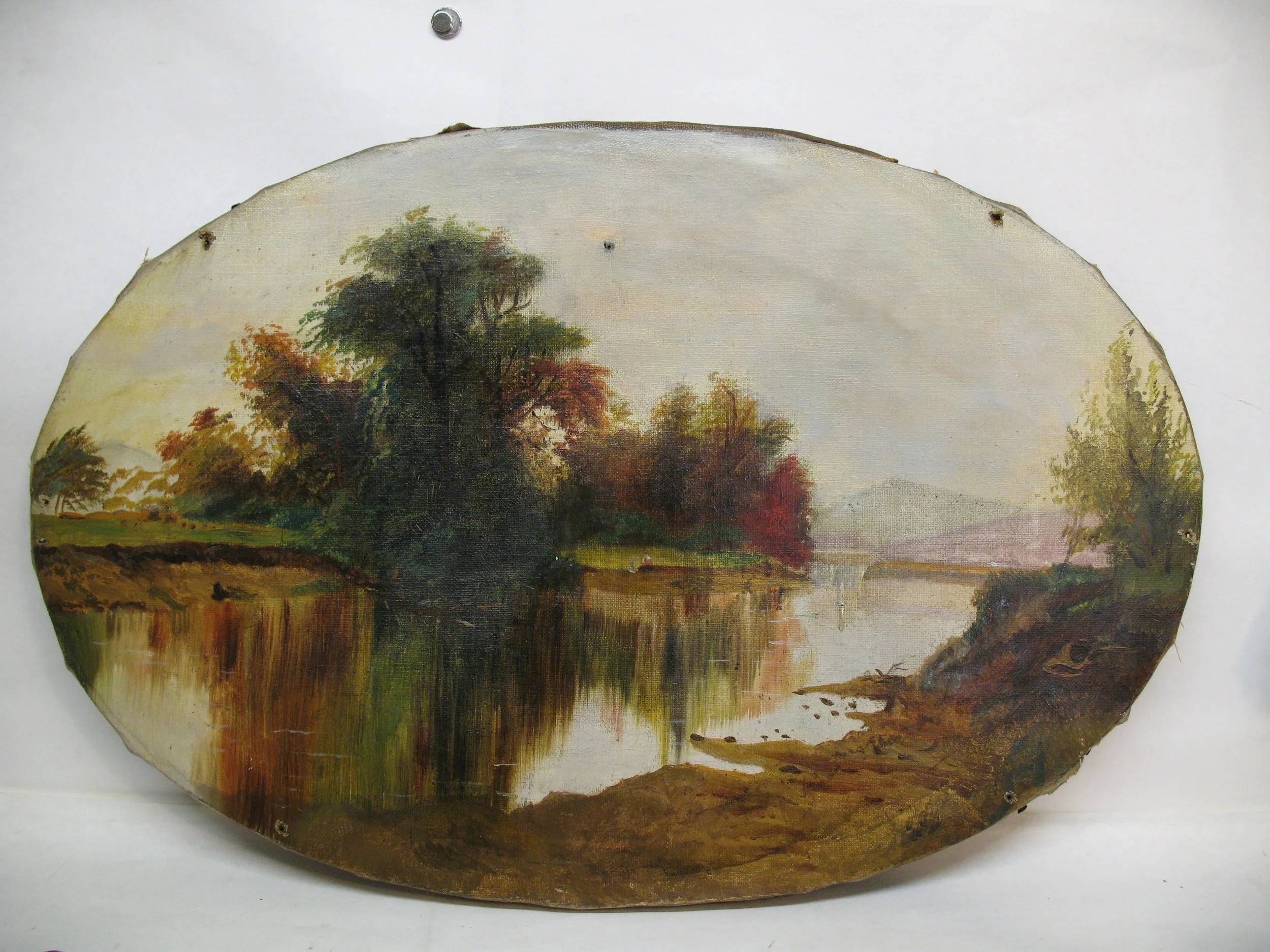 Landscape painting of trees and river on an oval-shaped wooden panel View fullsize