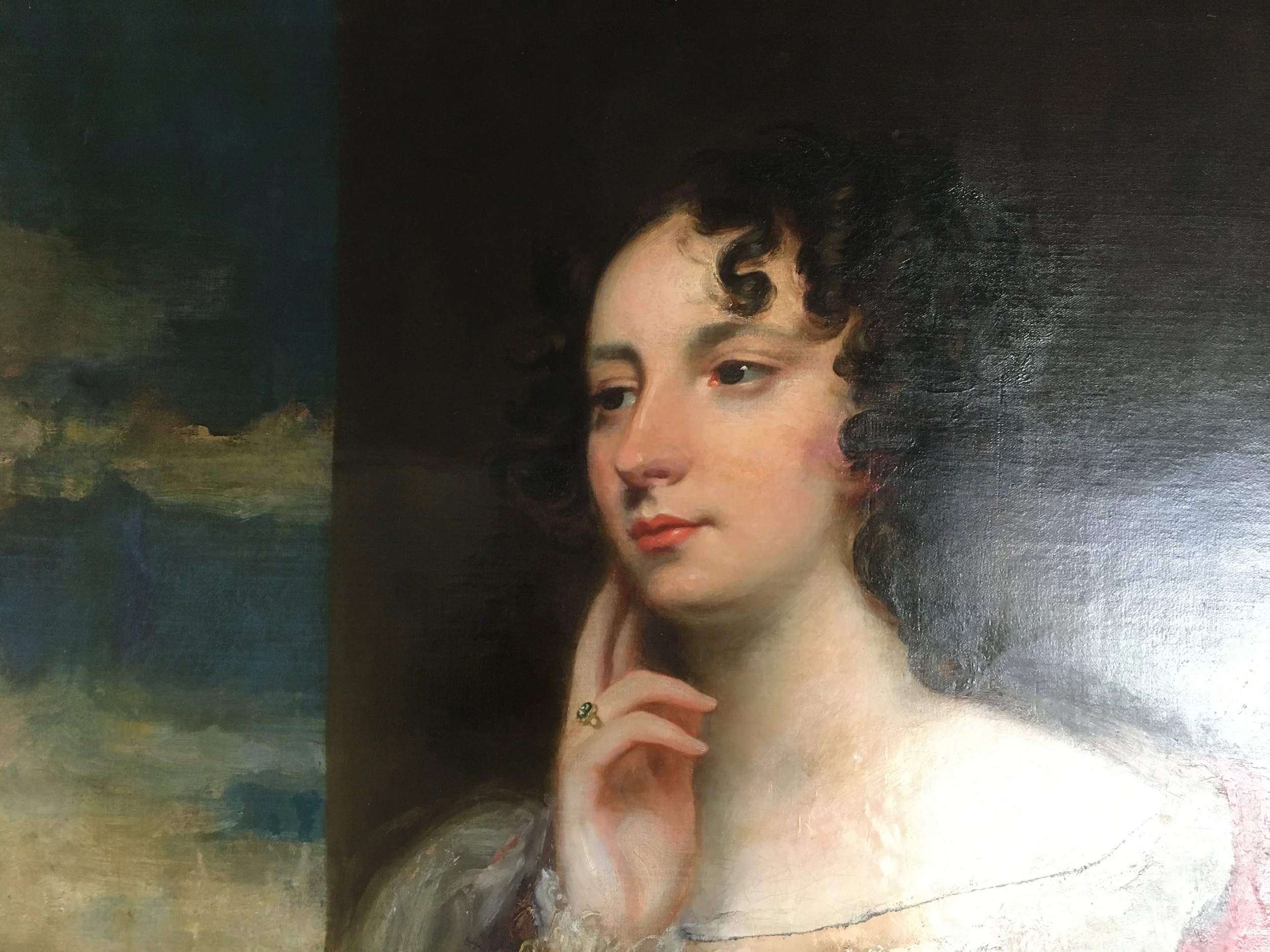 The painting after repair, a classical portrait painting of a woman with curly dark hair, red lips, and a contemplative expression, resting her chin on her hand, against a dark background with a hint of a landscape or sky.