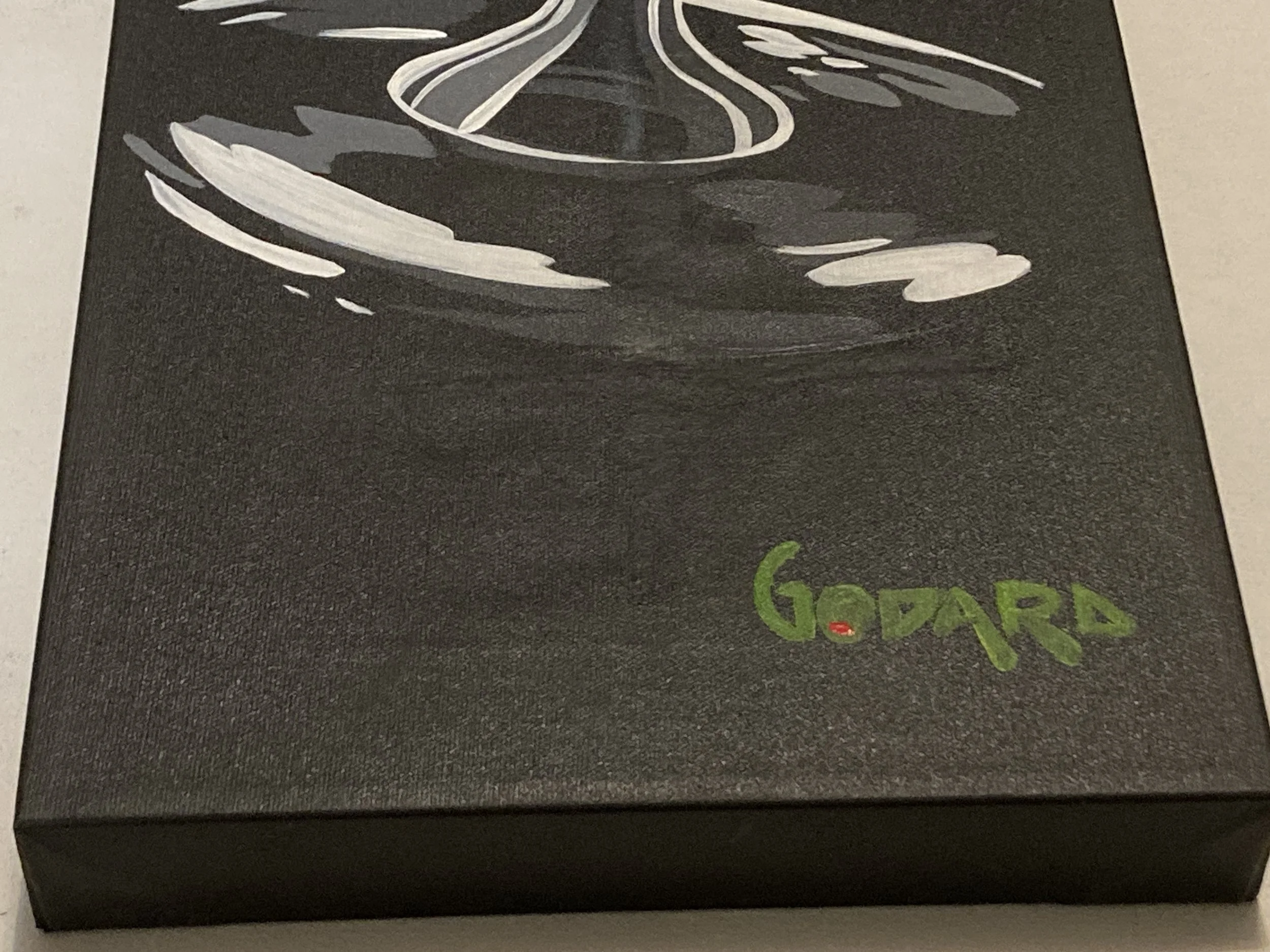 A black box with a white, abstract design on top and the words 'Gadra' in green with a red dot in the middle of the 'a'. View fullsize