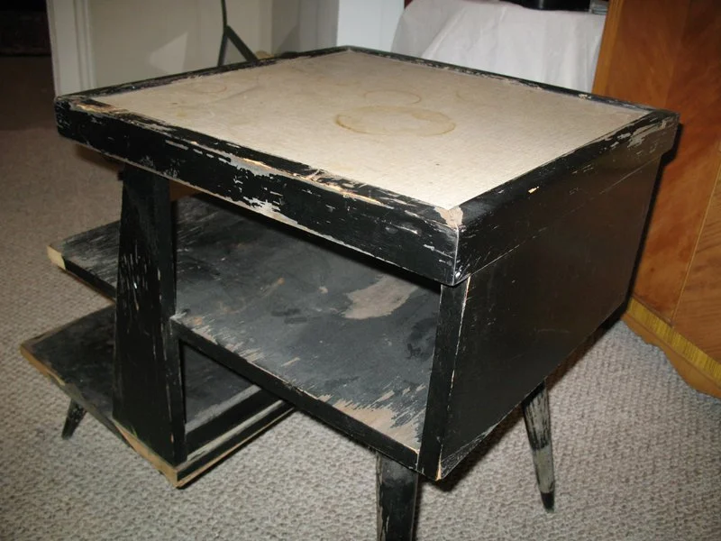 Old black wooden nightstand with two shelves, worn paint, and scratches, placed on a carpeted floor. View fullsize