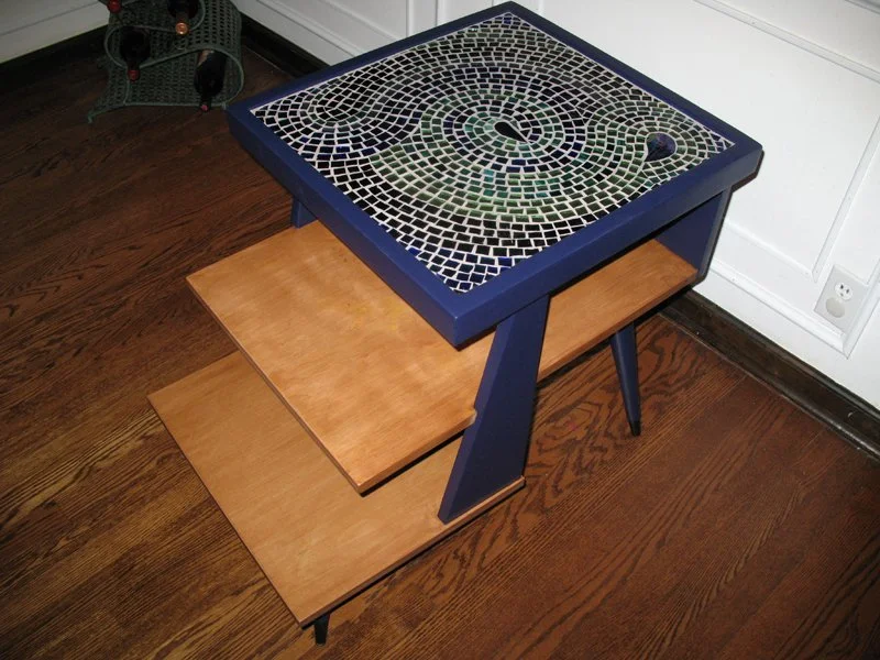 A small, modern side table with a mosaic top, two wooden shelves underneath, and four black tapered legs, placed on a wooden floor near a wall. View fullsize