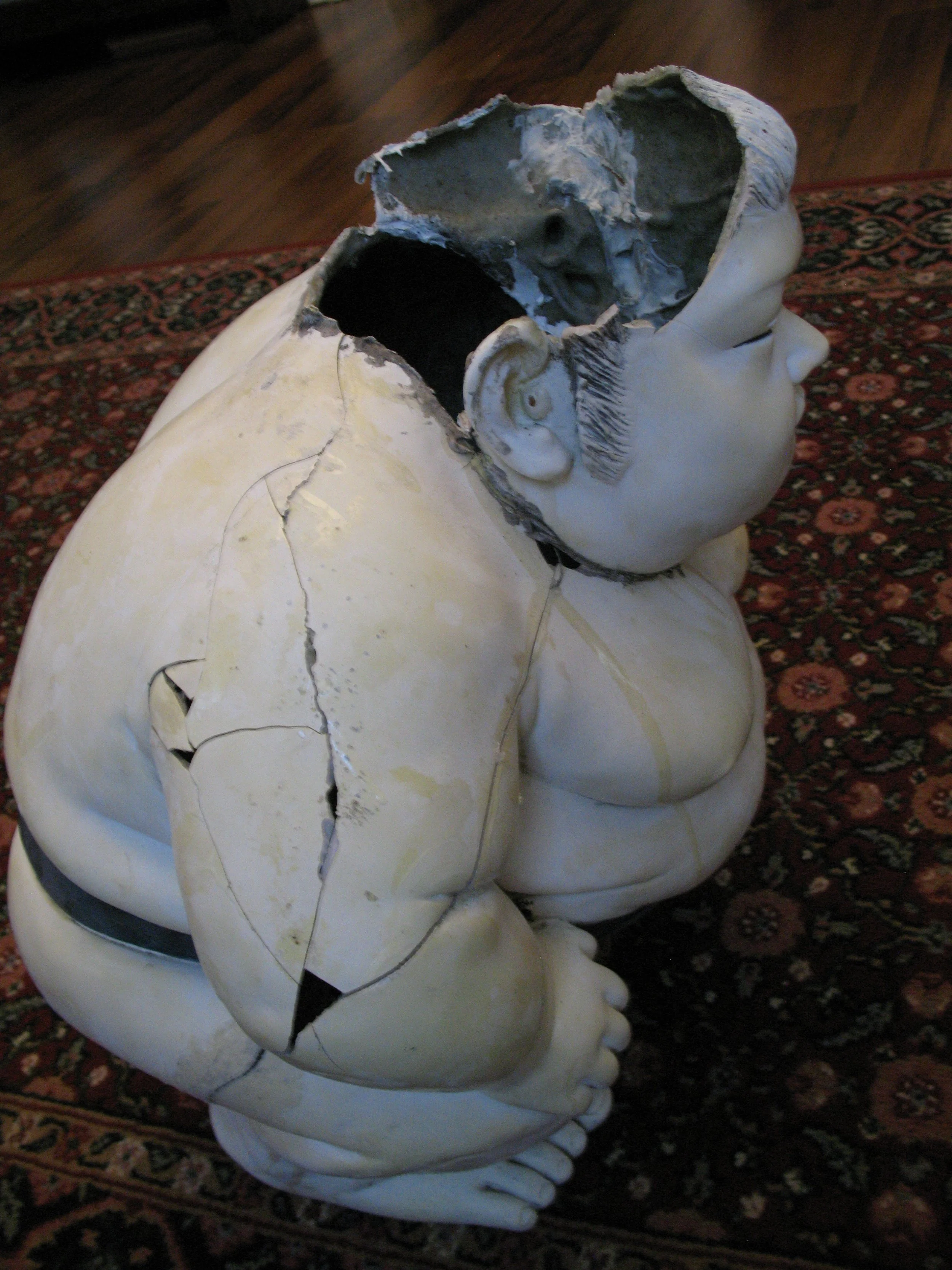 Resin sculpture of a sumo wrestler that has been broken and is missing a portion of his head. View fullsize