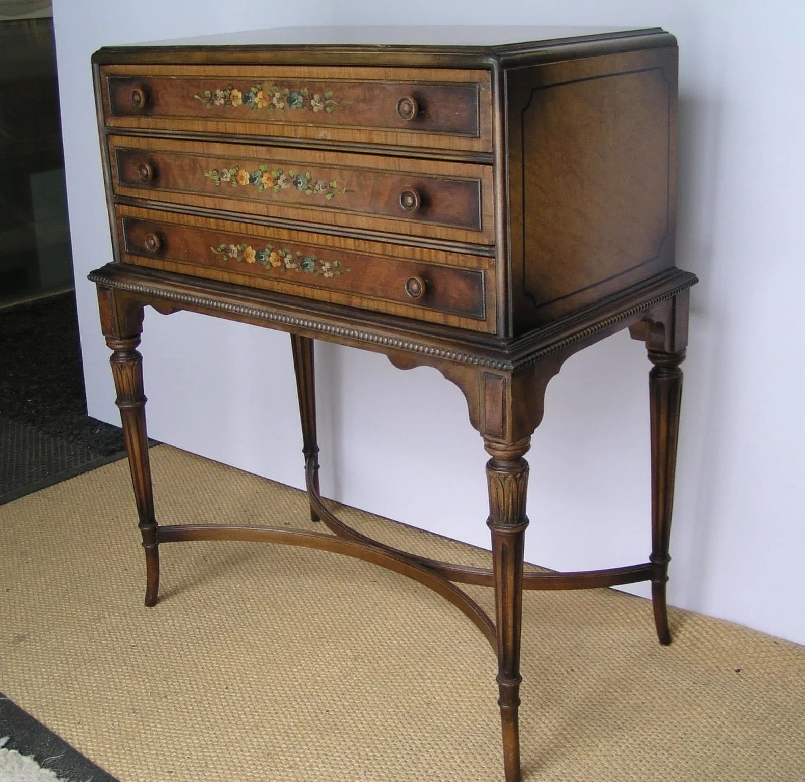 Vintage wooden carved side table with four drawers, floral painted details on the drawers, and cabriole legs, placed on a woven rug against a white wall. View fullsize