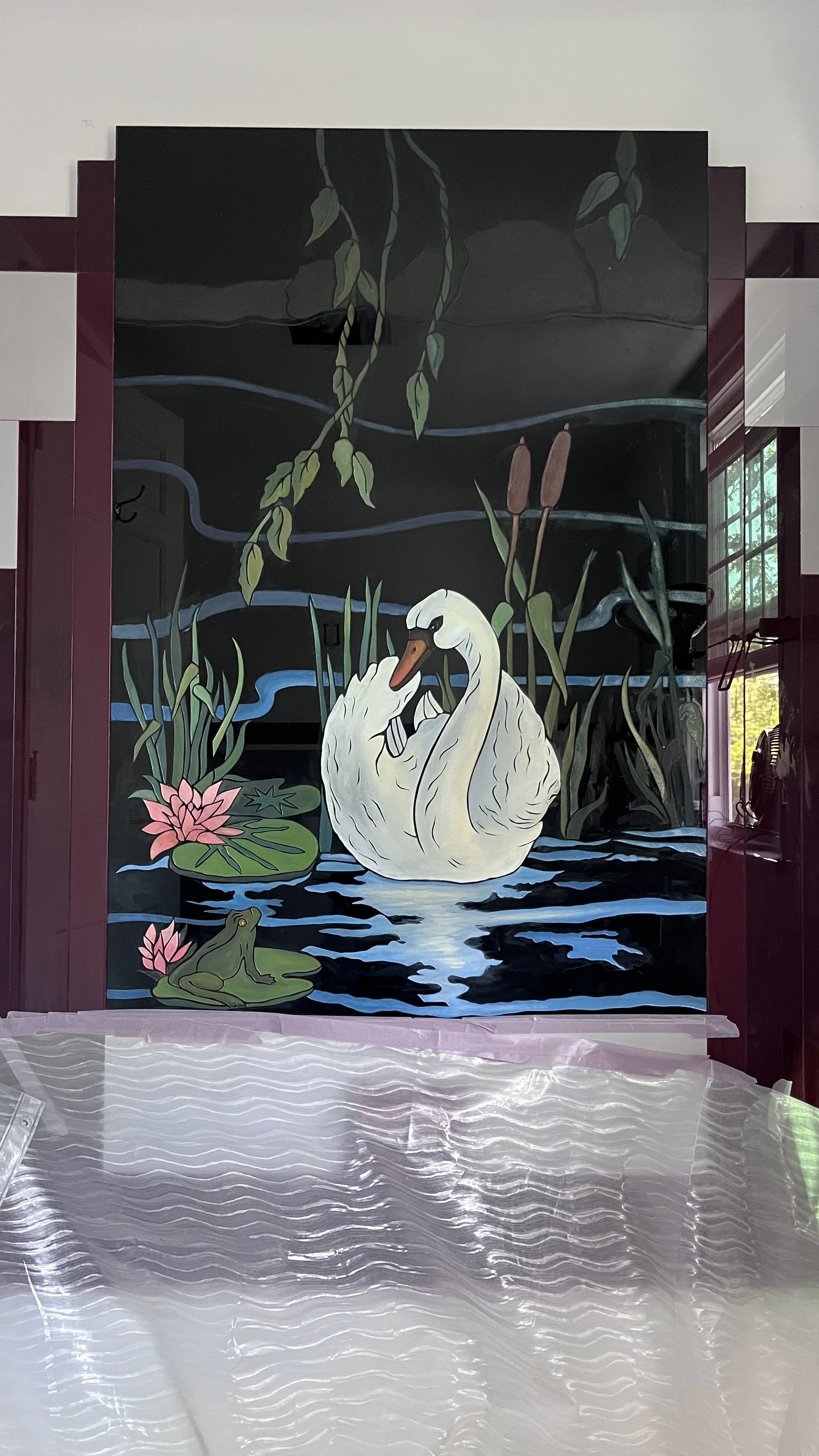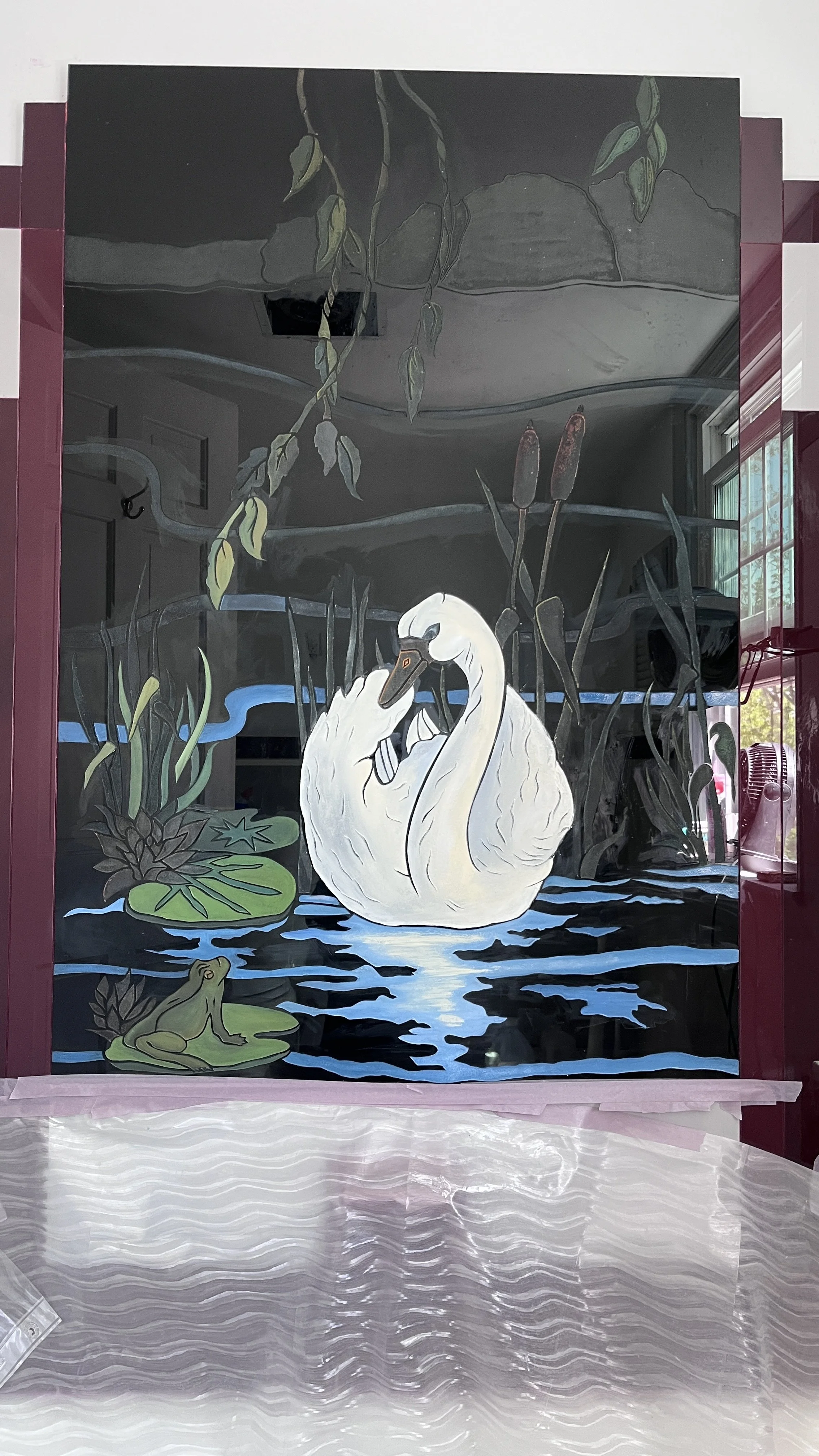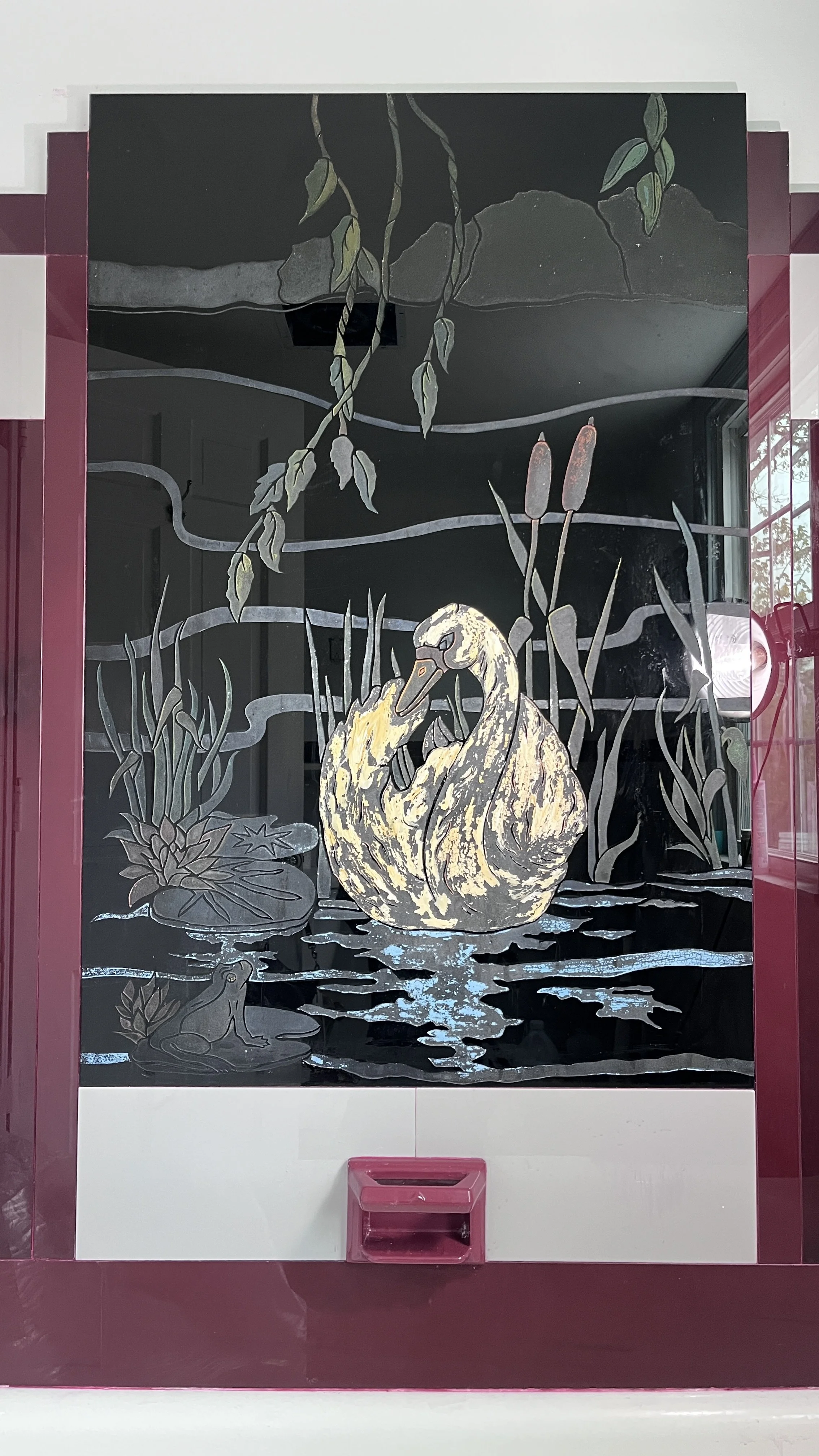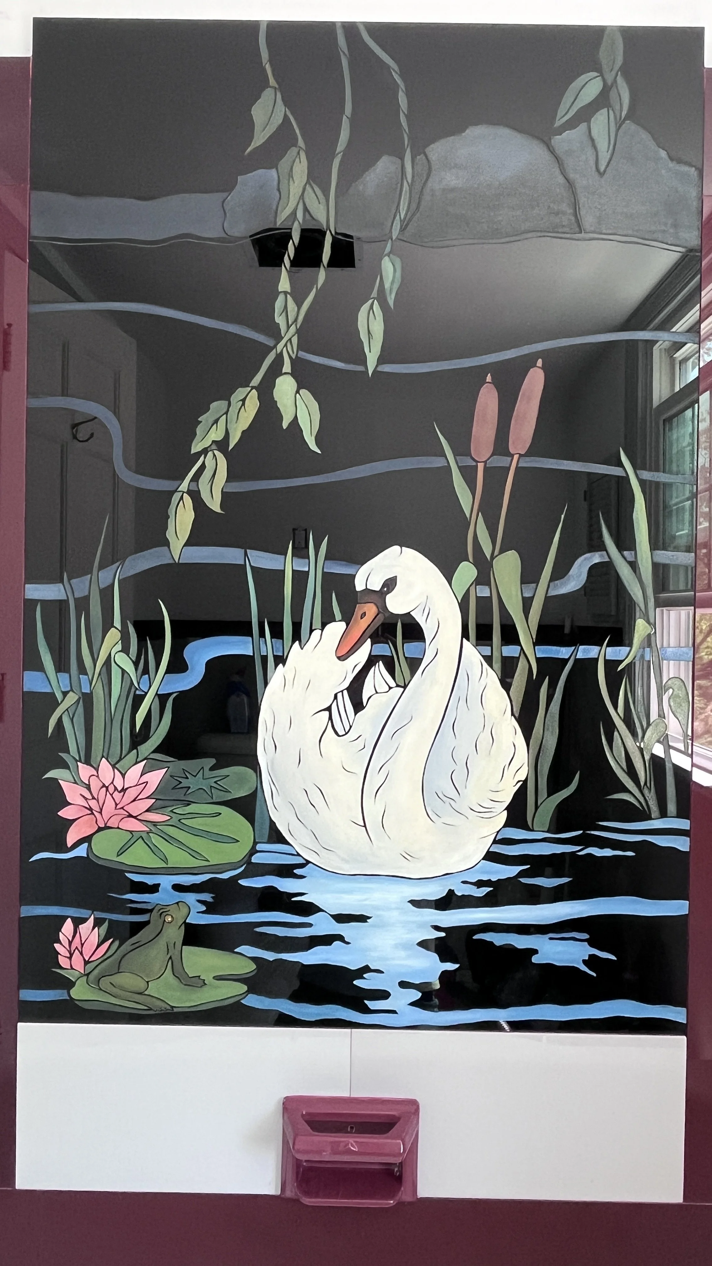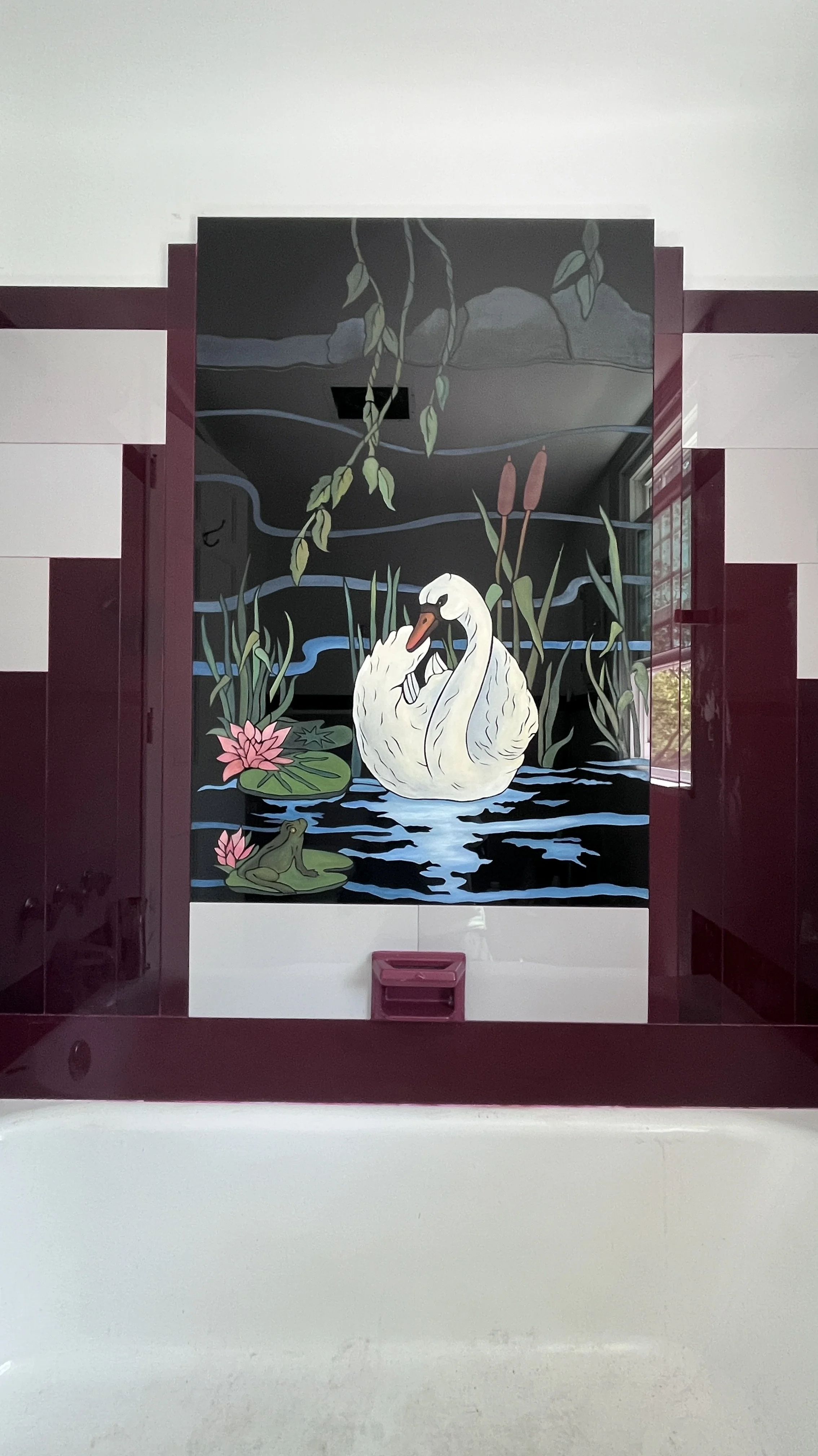 Vitrolite is a type of glass tile popular from 1920s-40s. This one is over the bath in a house in Indianapolis, IN. I restored the painting matching the original colors as closely as possible. You can watch a video of the process here.
