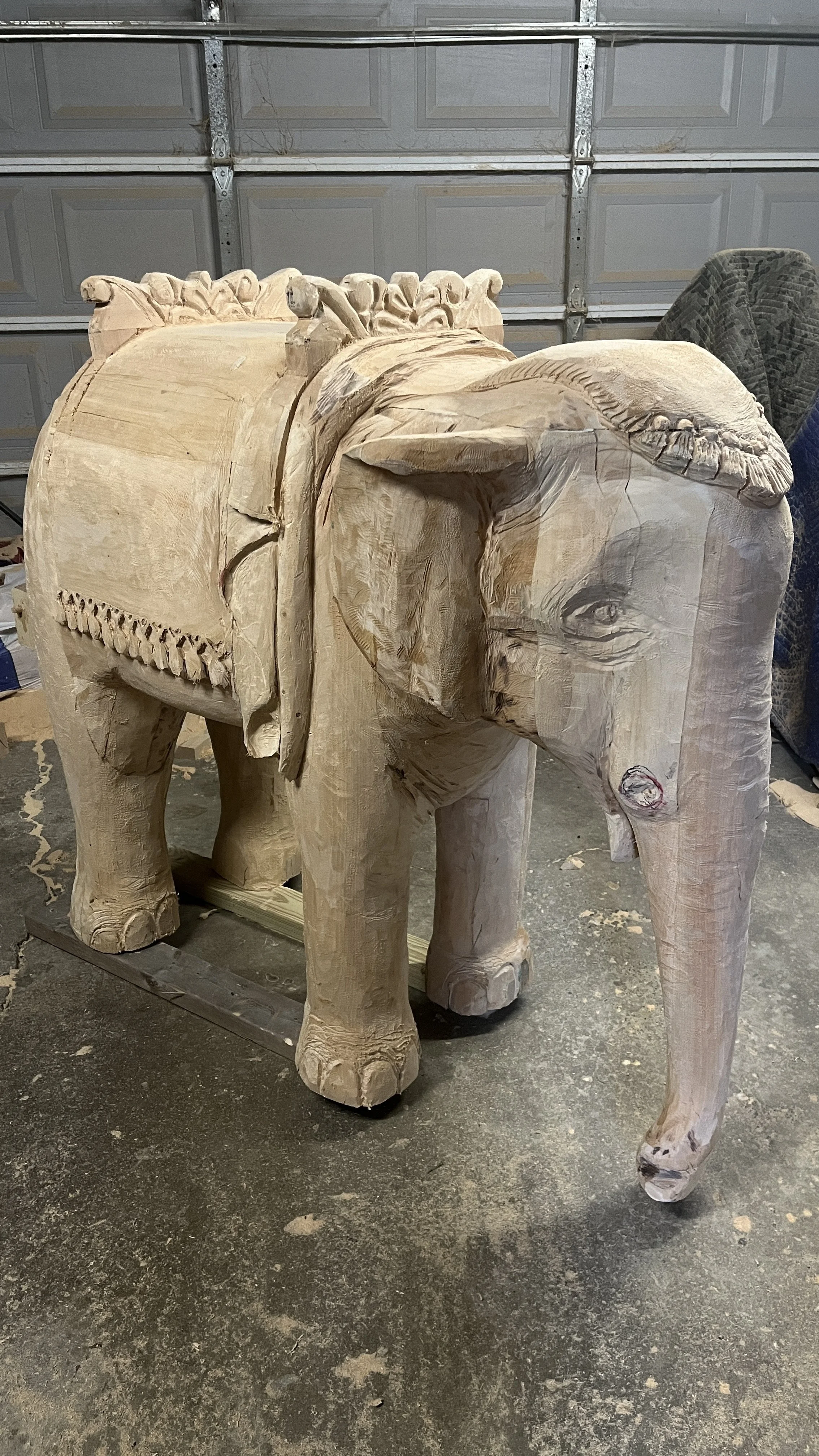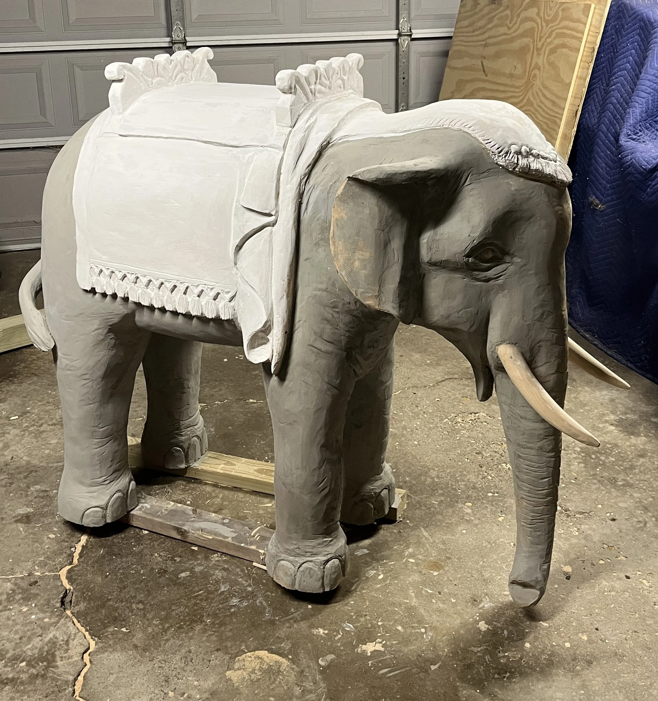 I carved and painted this elephant to replace one that was originally part of the set but went missing. It’s about 3x4 ft. made of basswood.