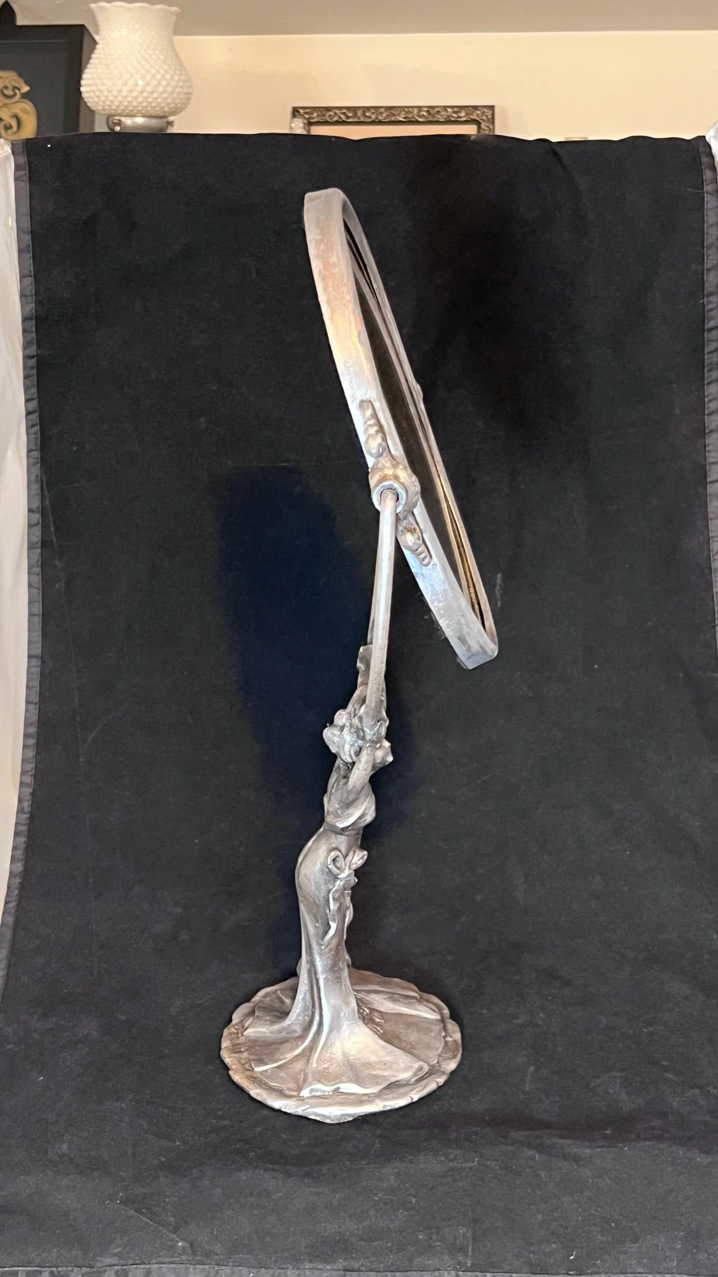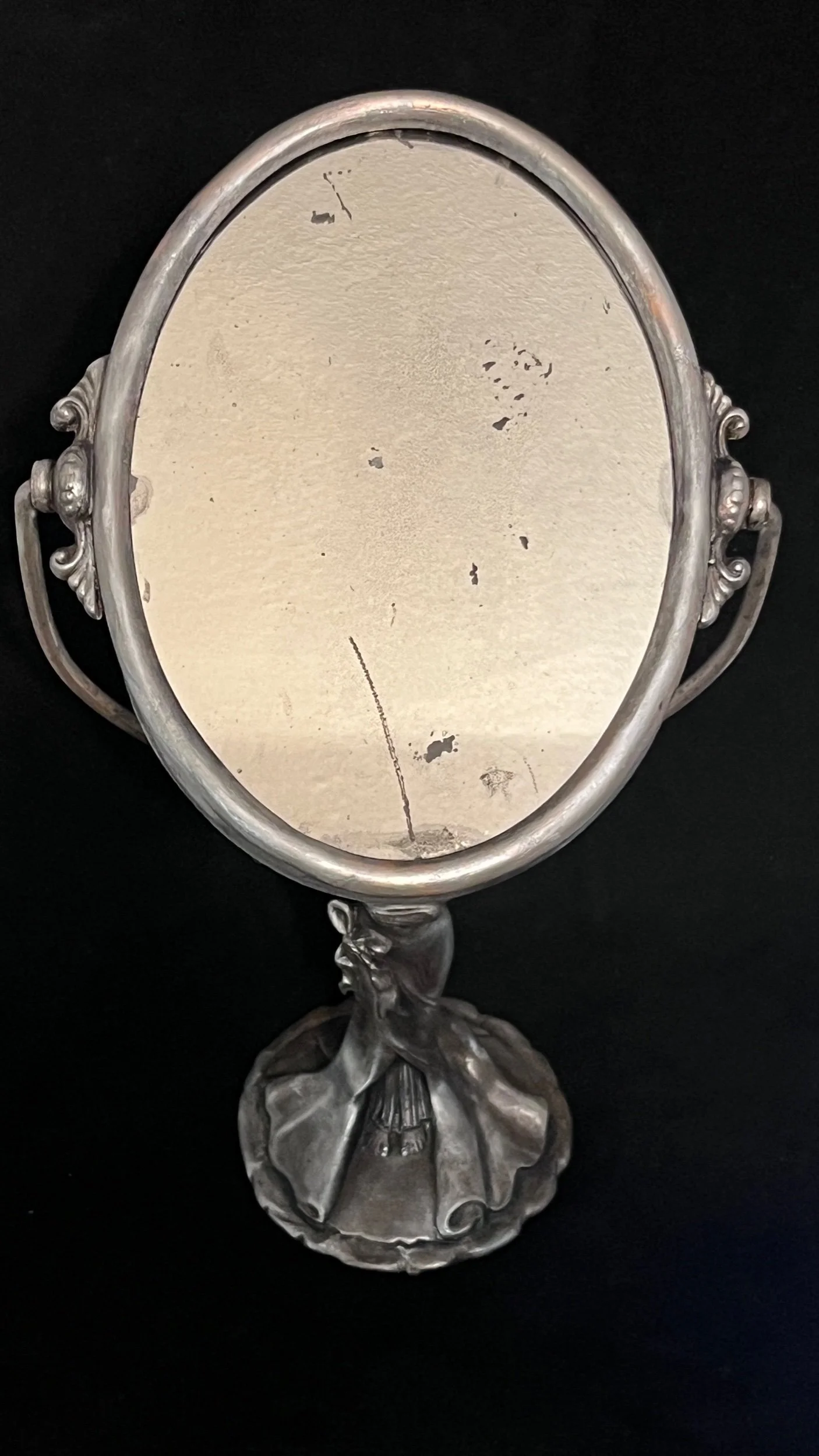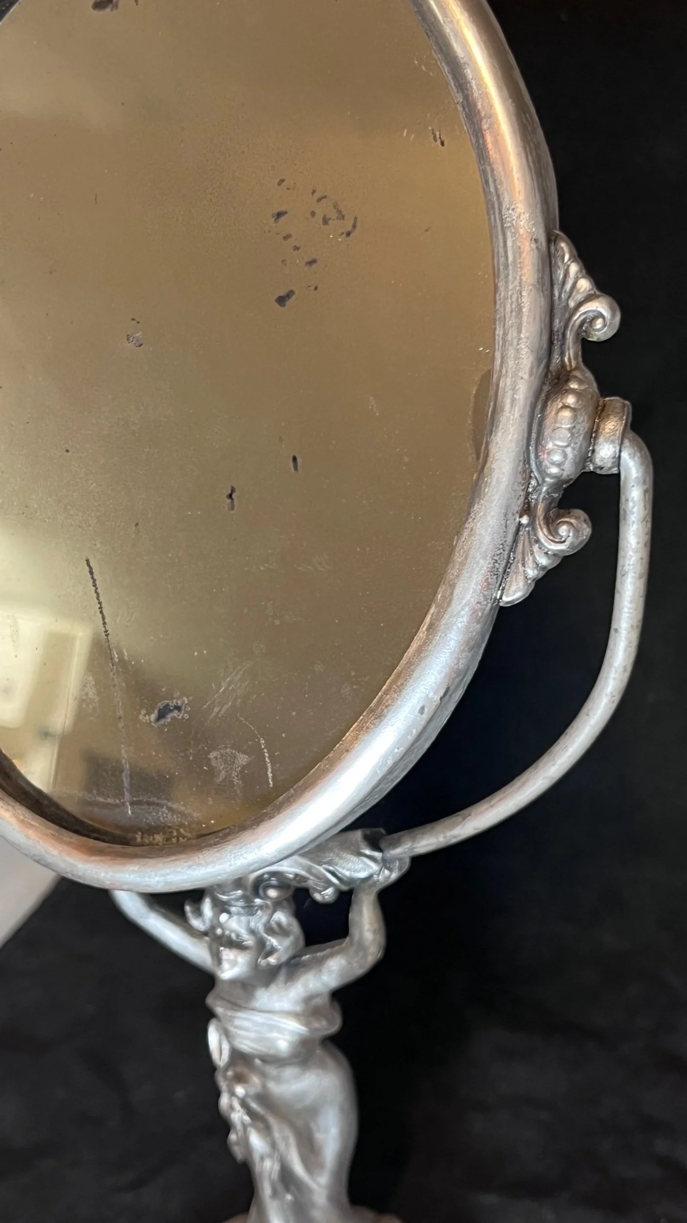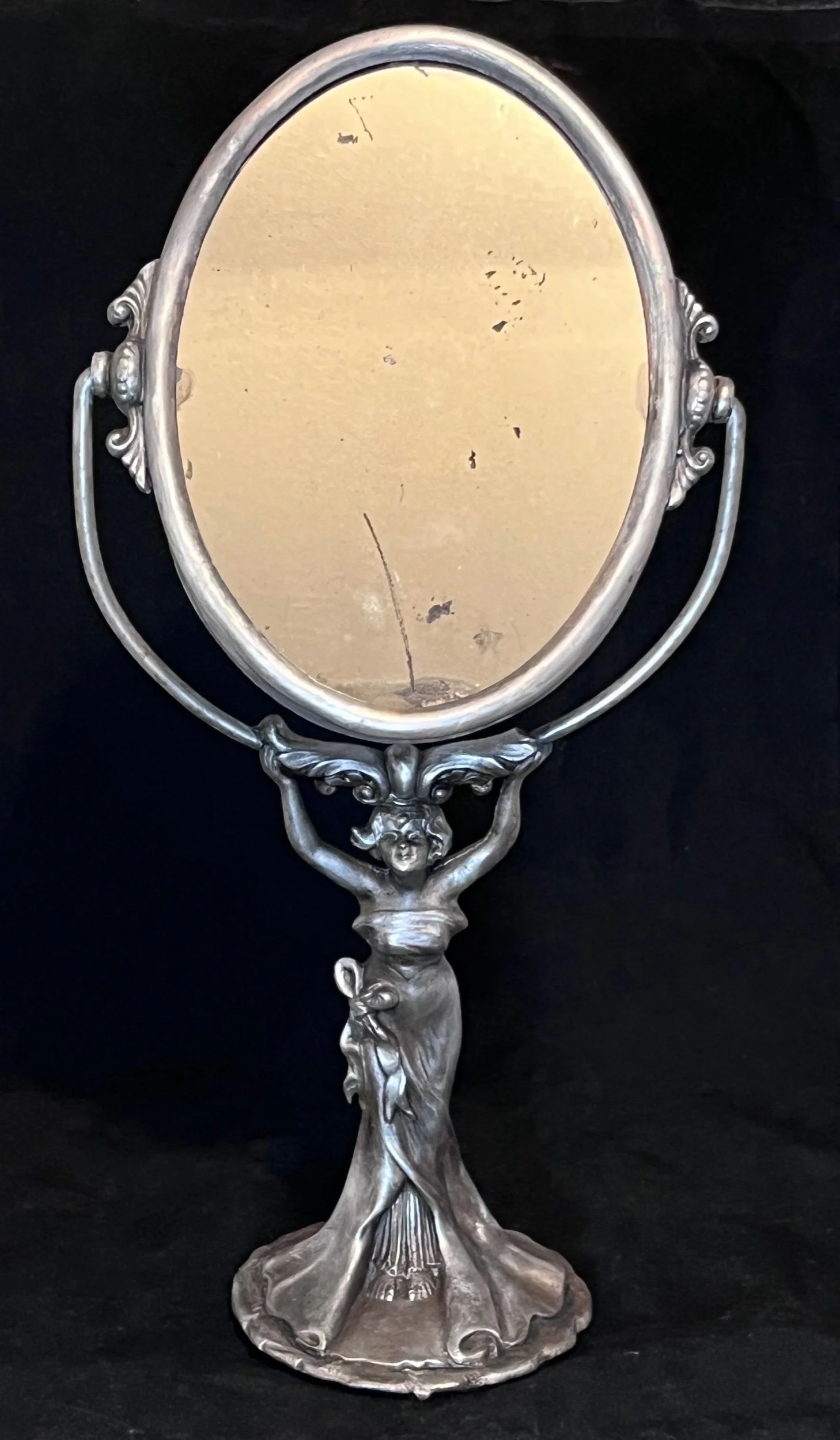 Beautiful Cast Iron Vintage Art Nouveau Woman Vanity Table Mirror with naturally distressed mirror due to age and use. New felt backing and base.