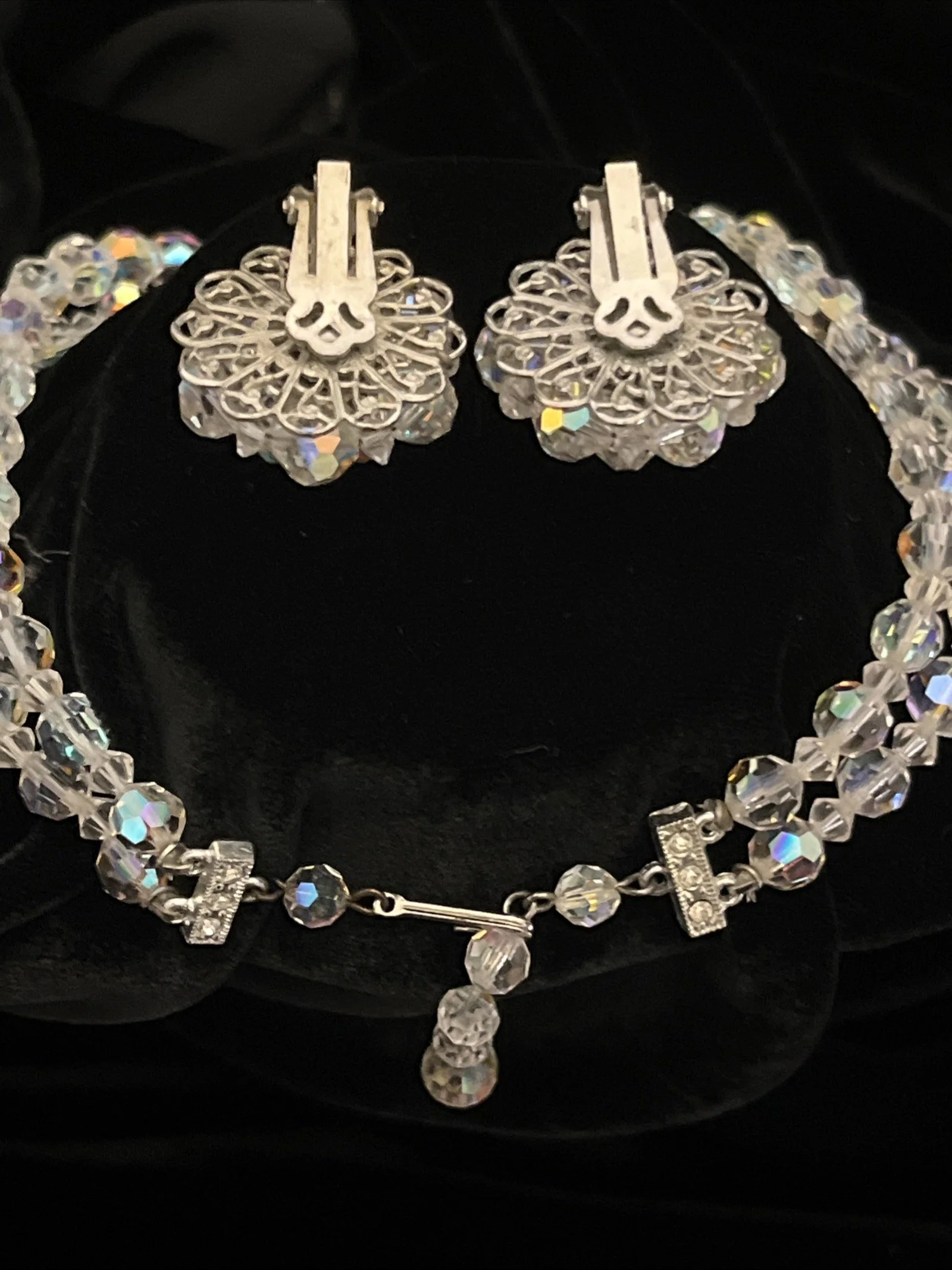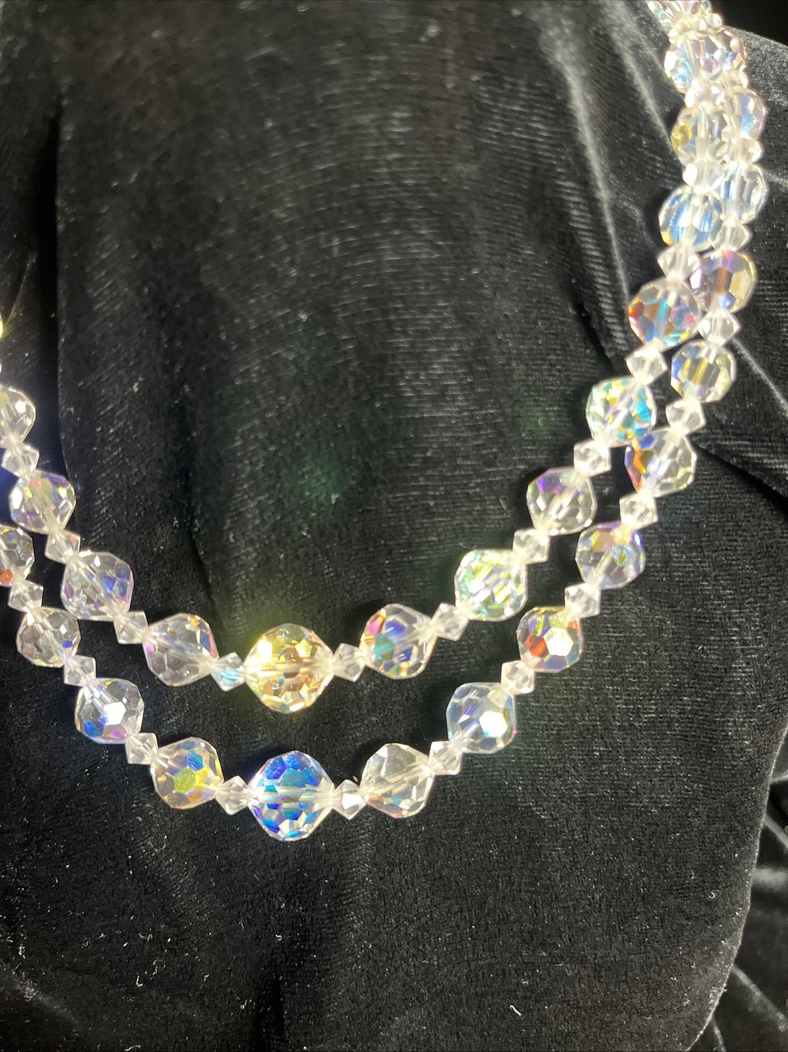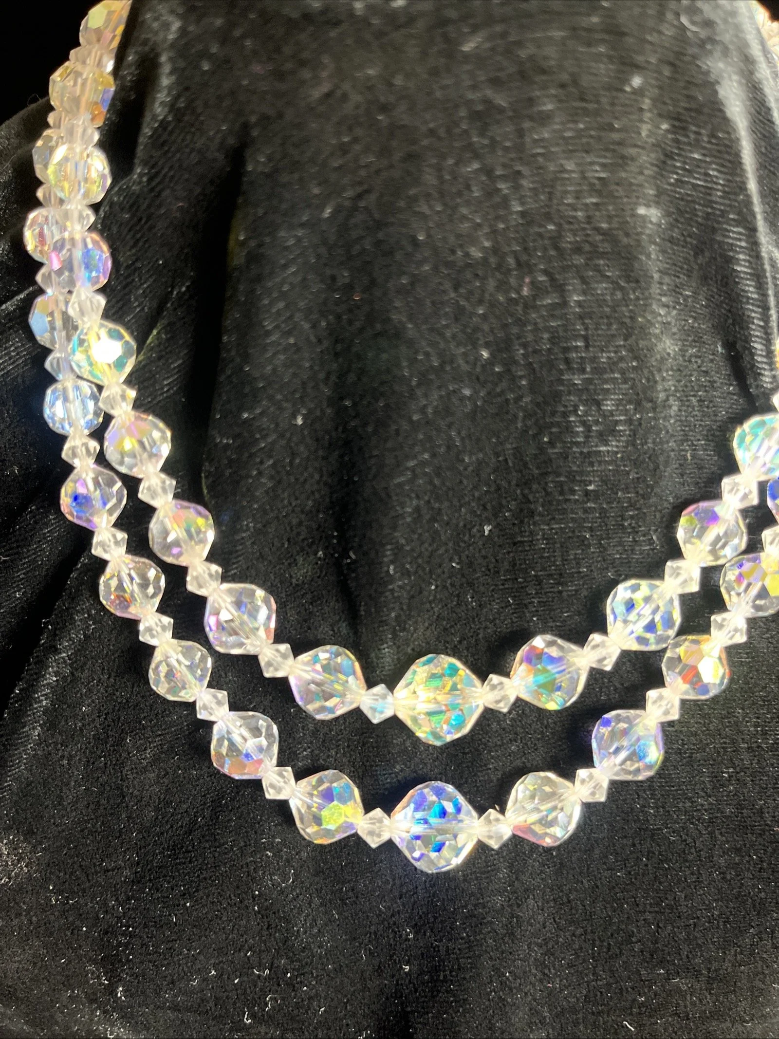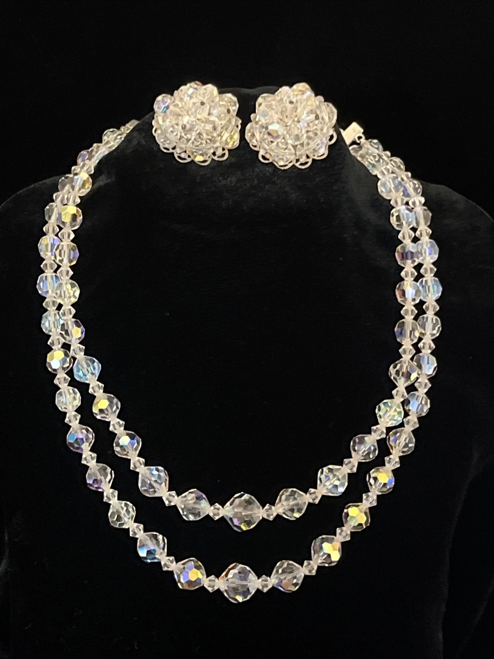 Gorgeous multifaceted iridescent 15" Vintage Double strand Crystal Necklace with Matching clip on earrings.