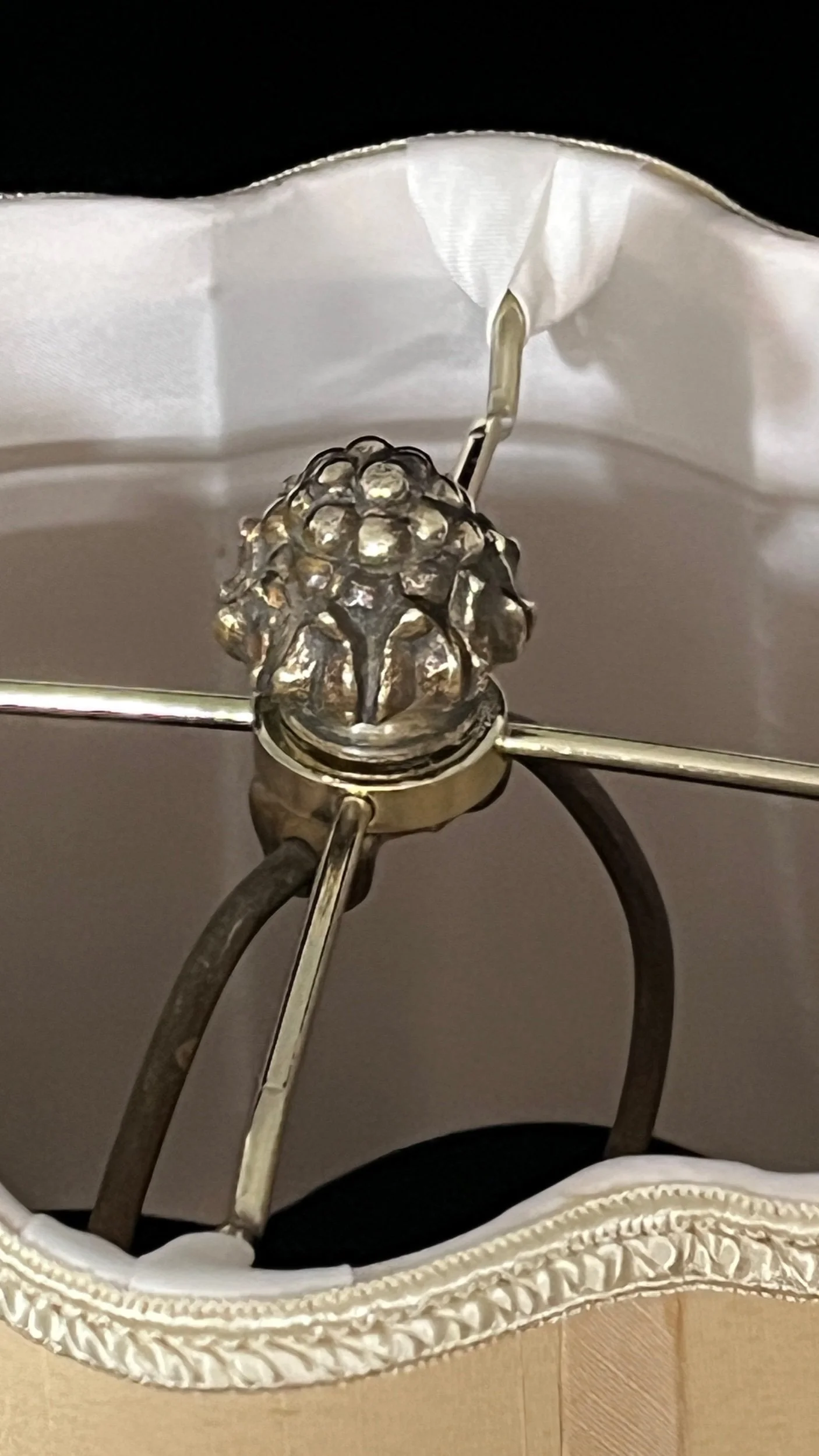 Gorgeous vintage hand carved alabaster boudoir/table/desk lamp with a vintage ruffle shaped shade and heavy brass fruit and leaf finial.